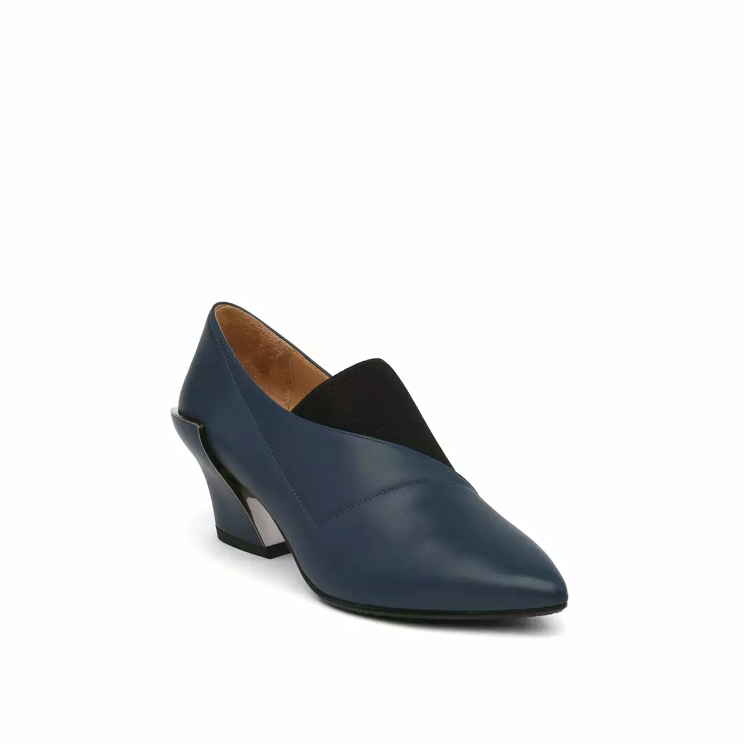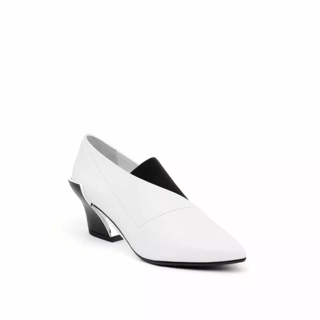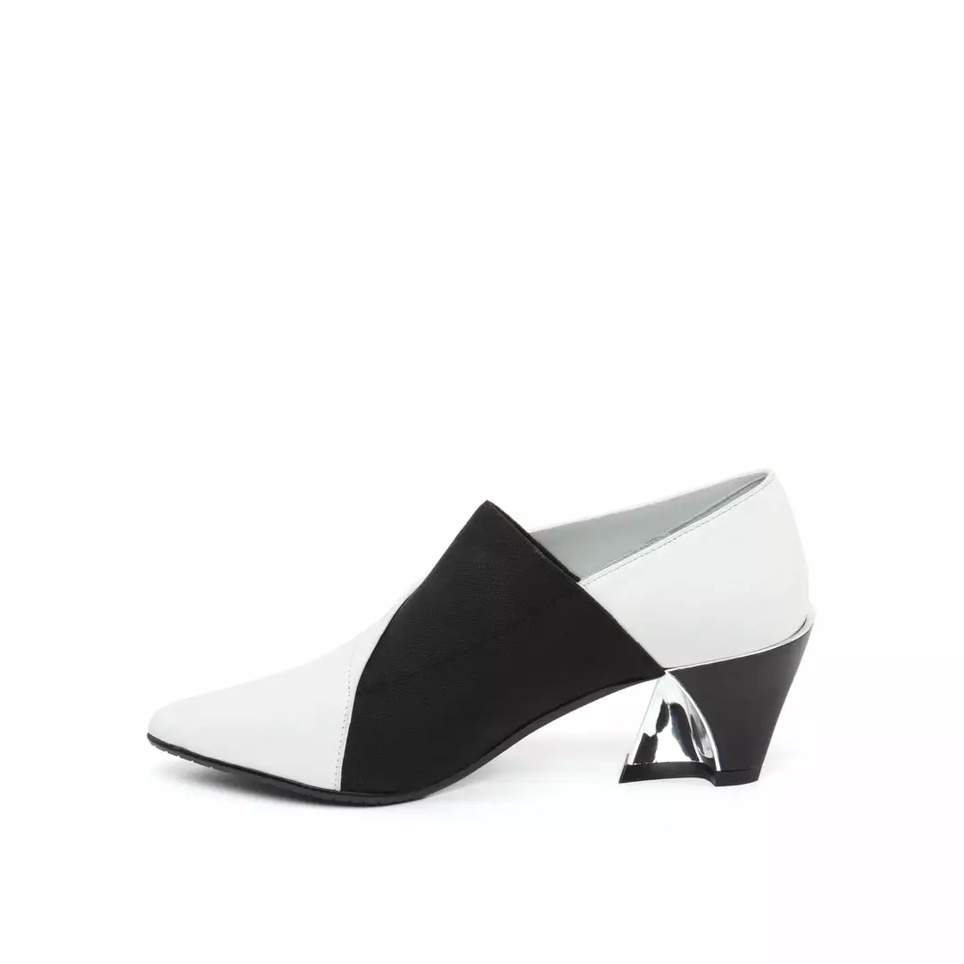 The Wrap Mid is a mid heel pointy toe ankle bootie lifted by a soft curving chromed block heel. The wrap was designed with the concept of enveloping the foot with a single sheet of leather. An elastic band is entwined in the upper for easy on and off wear.