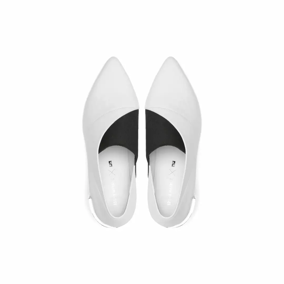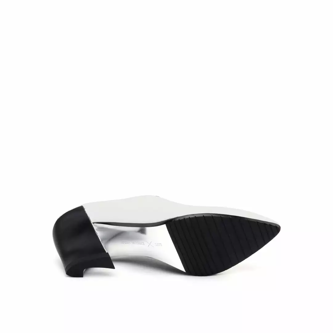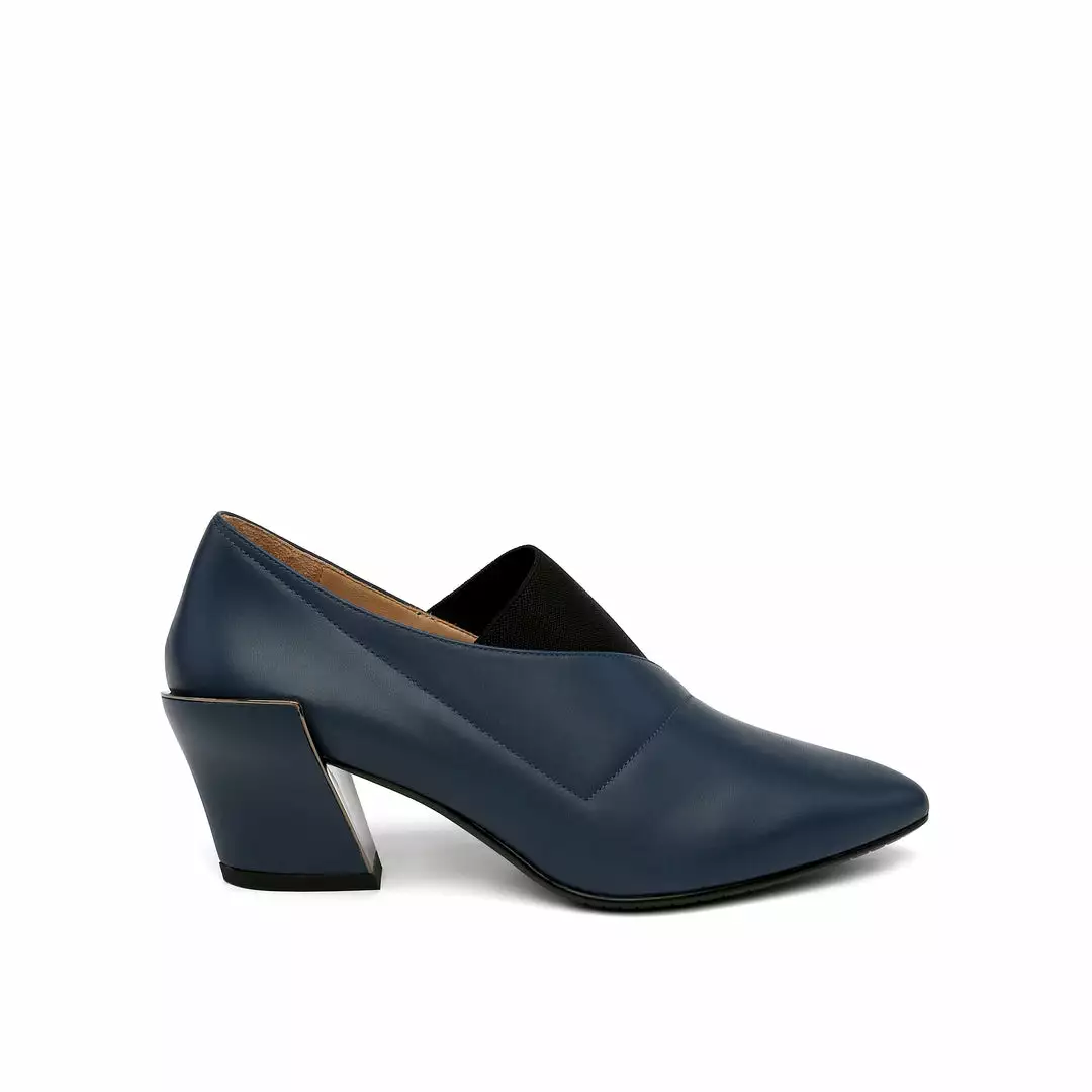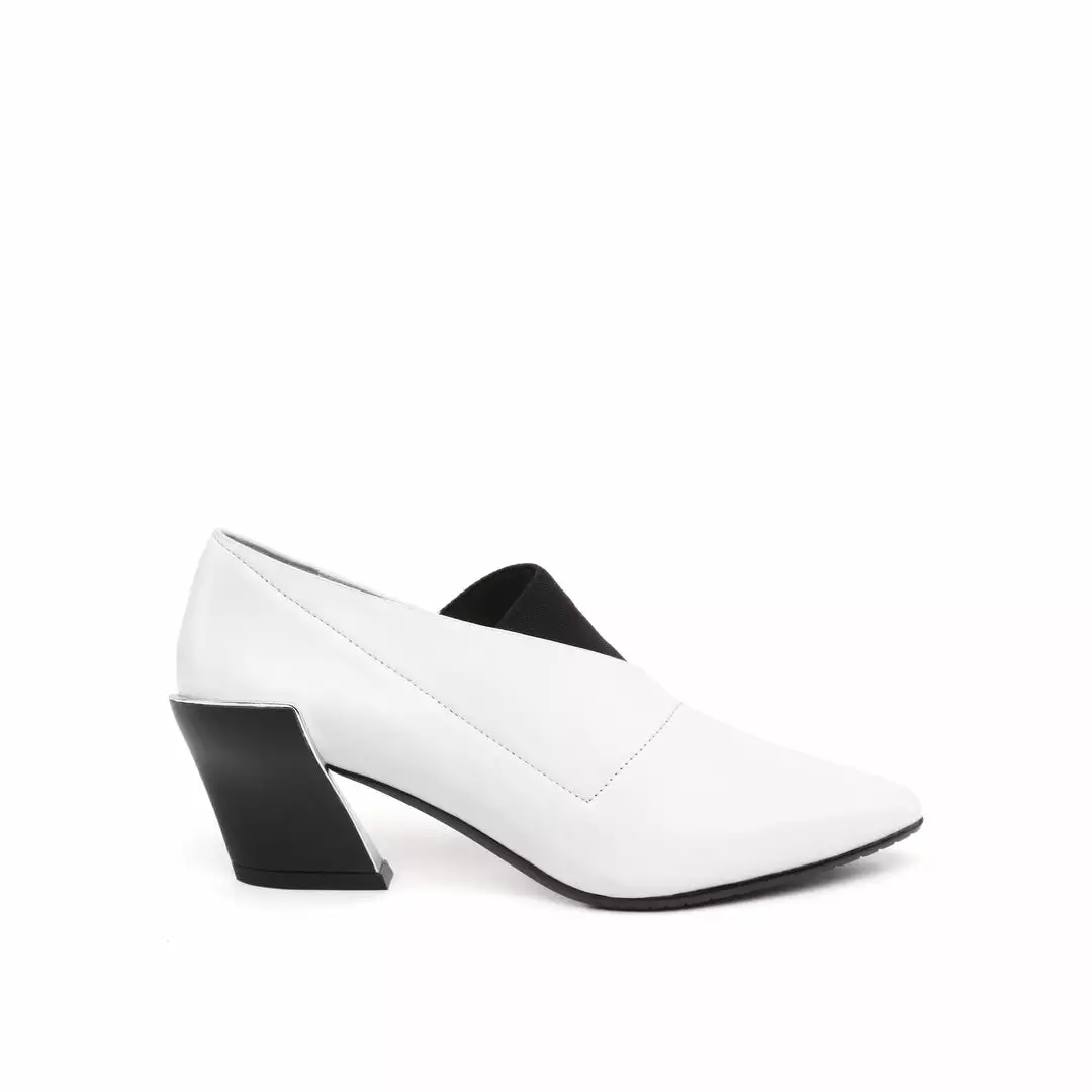 The Wrap Mid is a mid heel pointy toe ankle bootie lifted by a soft curving chromed block heel. The wrap was designed with the concept of enveloping the foot with a single sheet of leather. An elastic band is entwined in the upper for easy on and off wear.