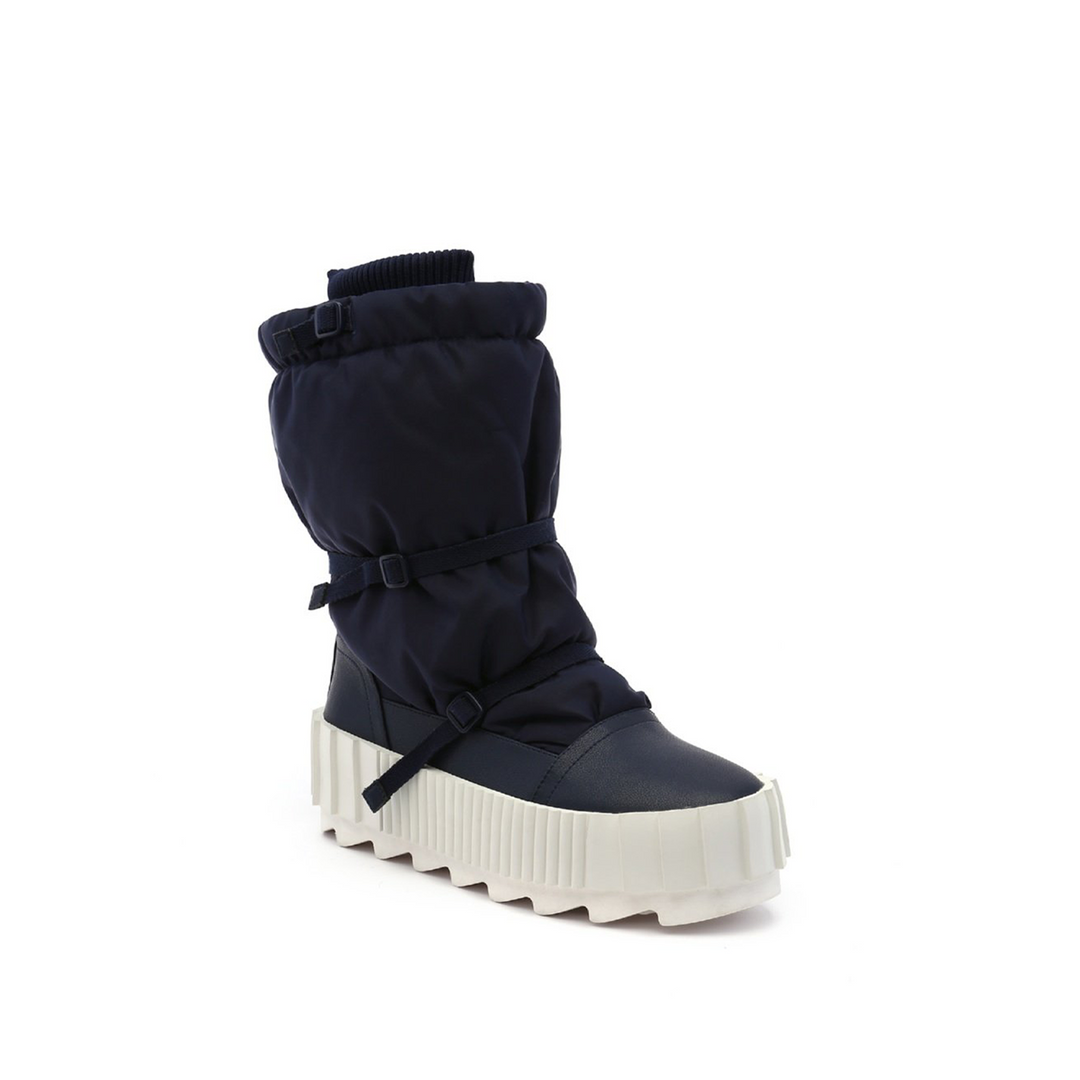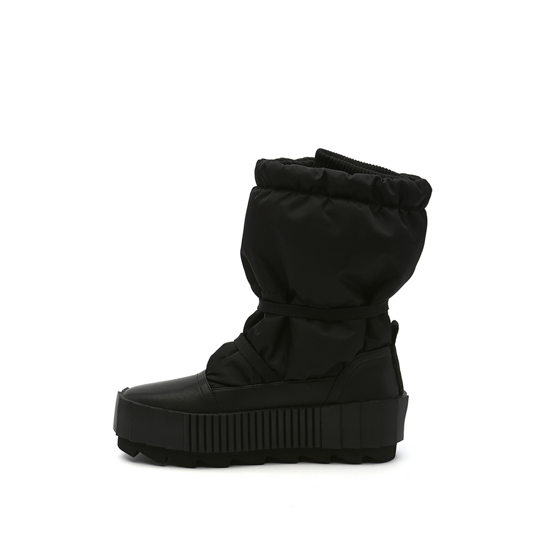 The Arctic Boot is a mid-calf cold weather boot. The puffy nylon upper, which is cinched by slim utility straps and finished with a cozy ribbed cuff, sits atop a statement cleated platform.