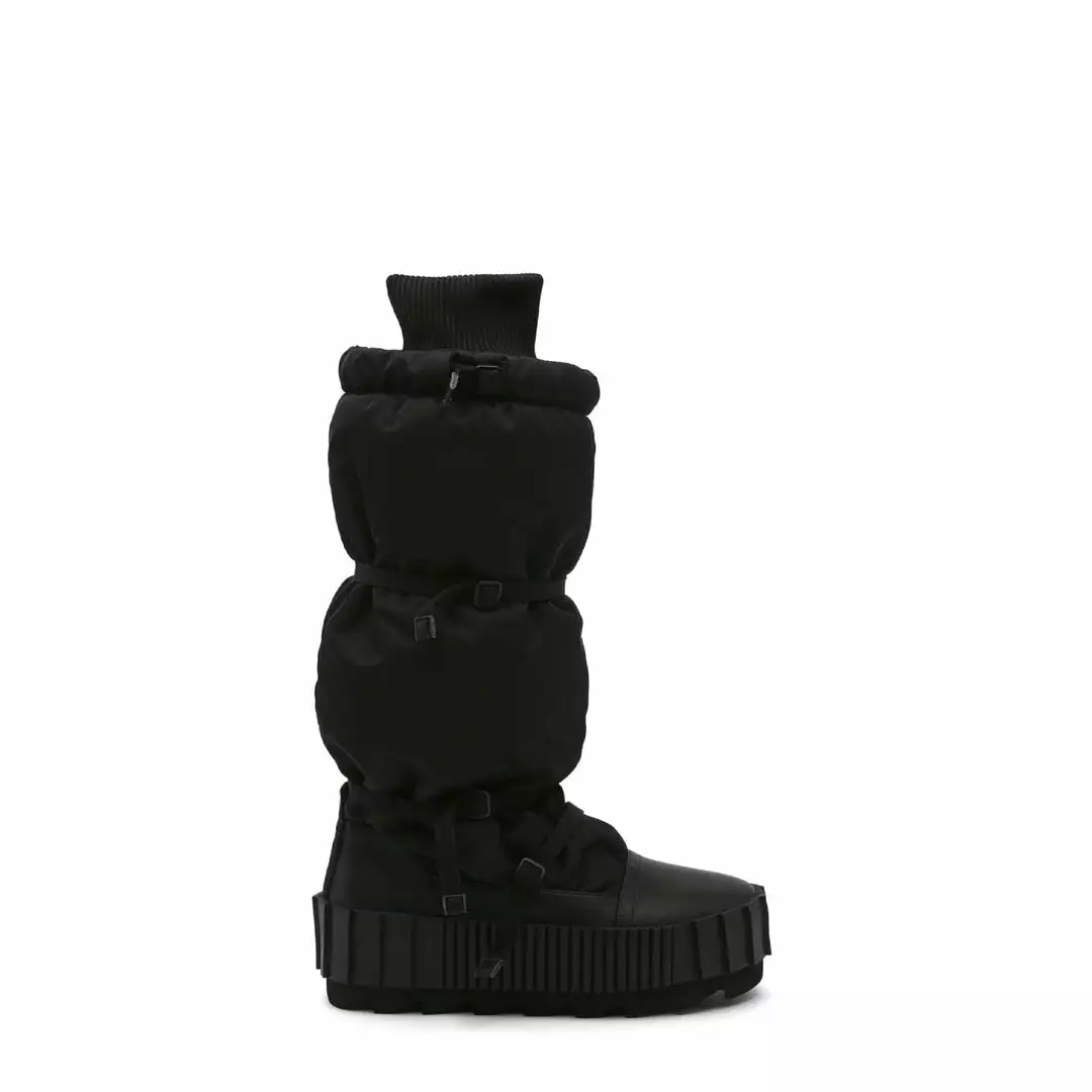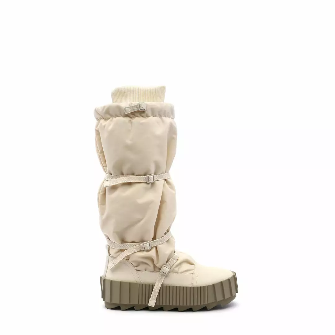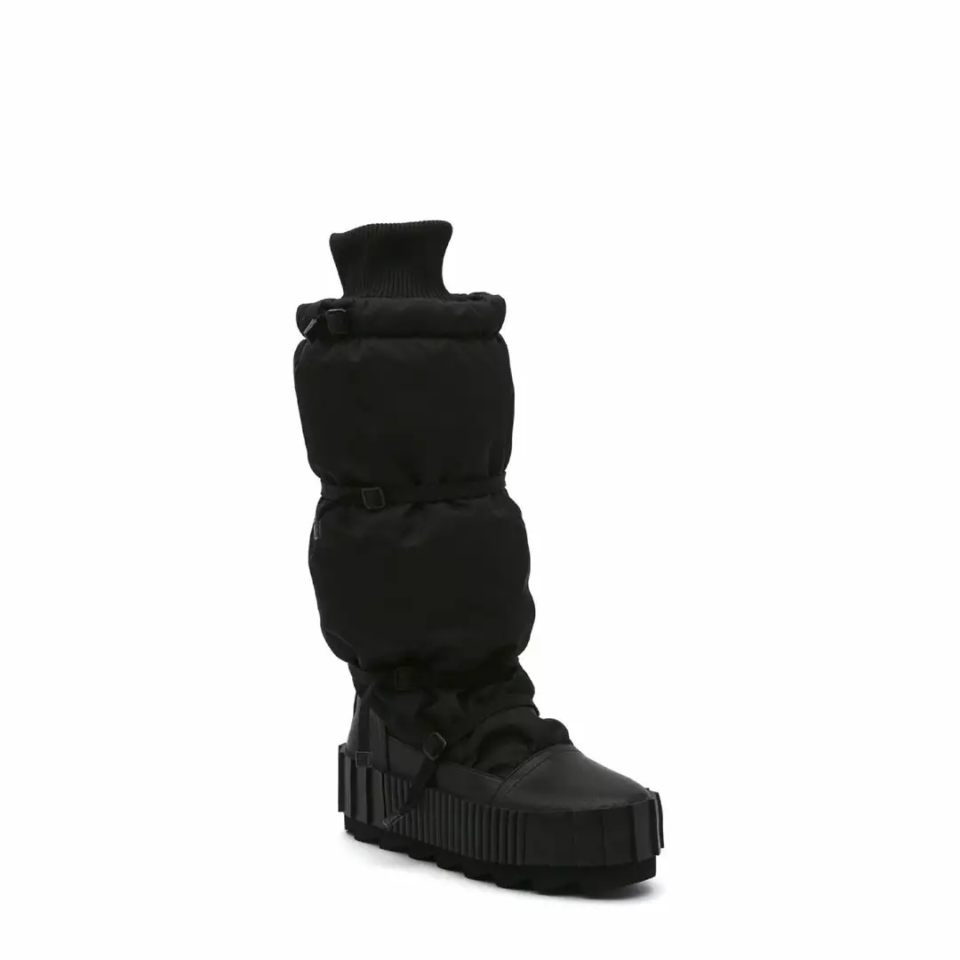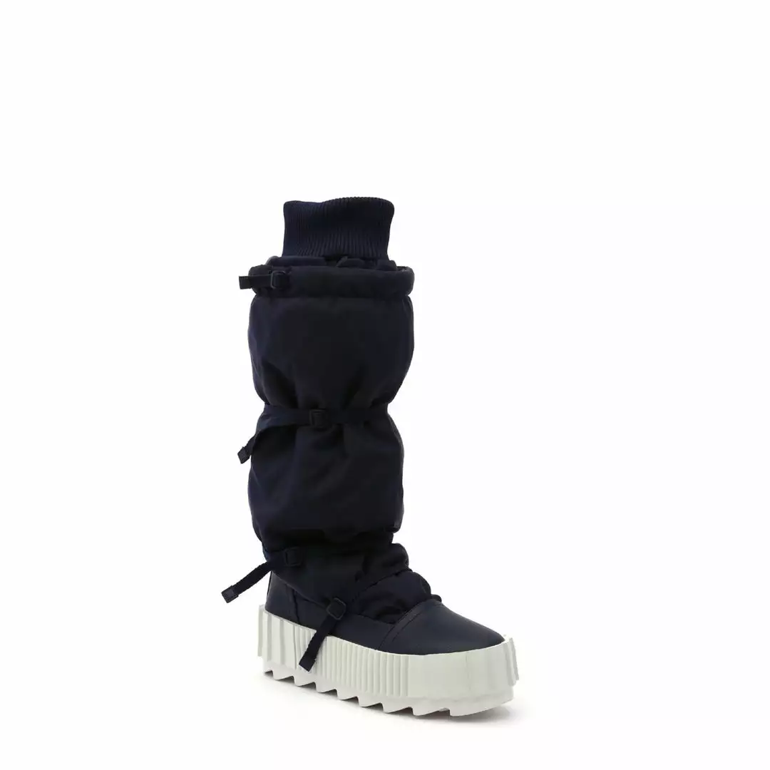 The Arctic Knee Boot is a cold weather knee-length boot. The puffy nylon upper, which is cinched by slim utility straps and finished with a cozy ribbed cuff, sits atop a statement cleated platform.