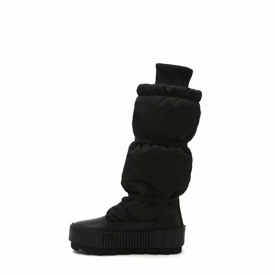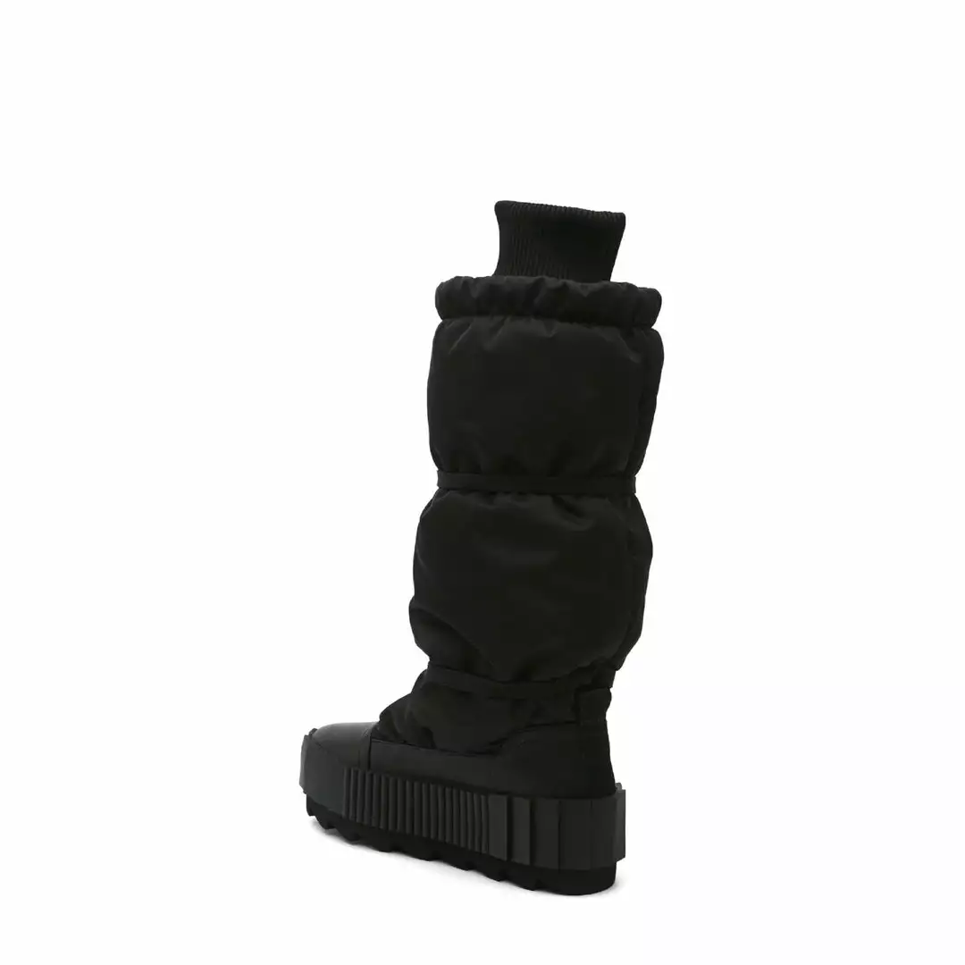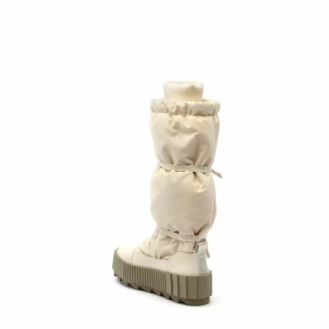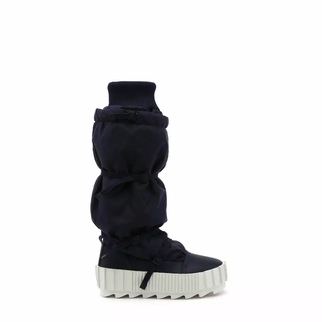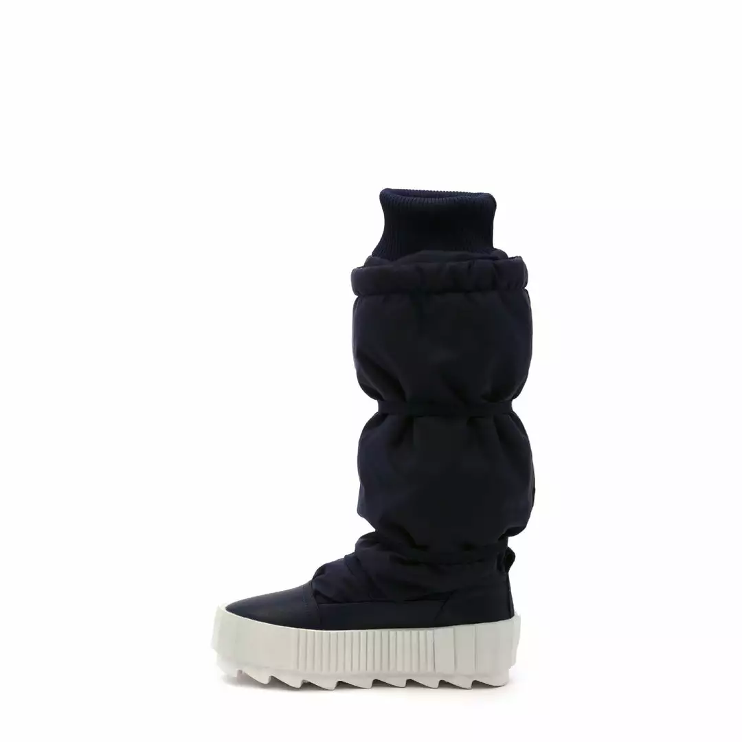 The Arctic Knee Boot is a cold weather knee-length boot. The puffy nylon upper, which is cinched by slim utility straps and finished with a cozy ribbed cuff, sits atop a statement cleated platform.