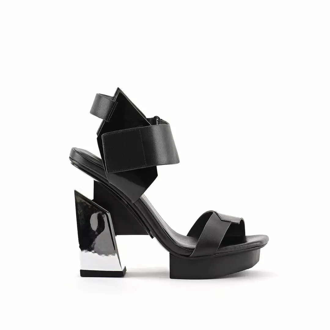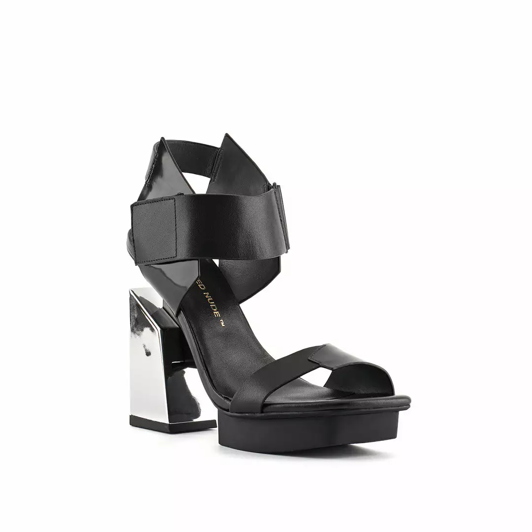 The Arix Sandal features a trapezoid block heel, a nappa leather upper, and a velcro top strap for easy on-and-off wear. This style showcases a modernist appeal and is available in high and mid heel heights.