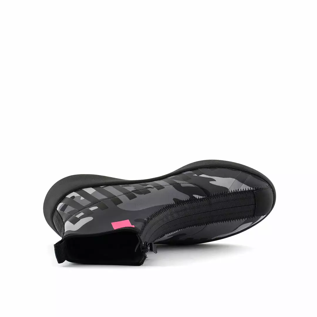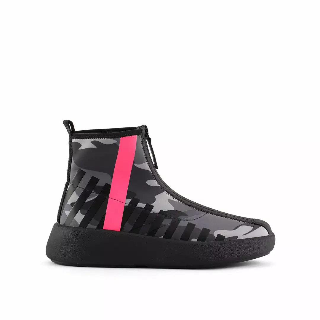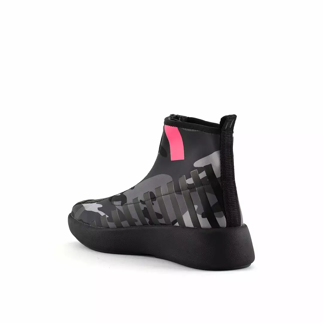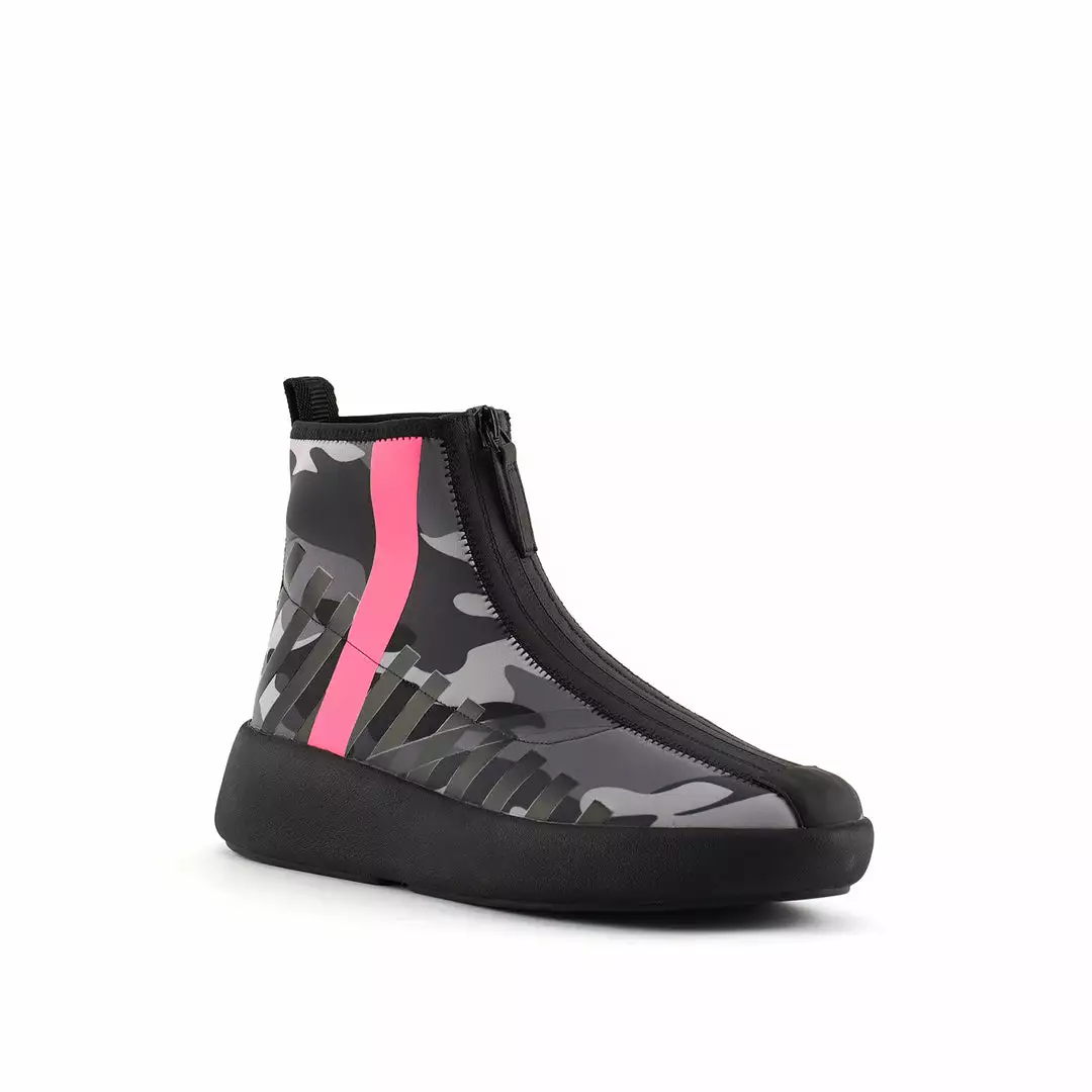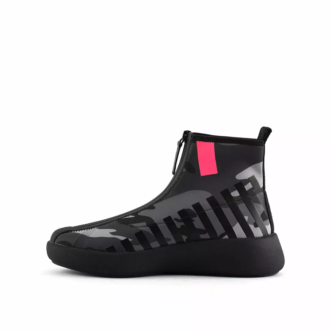 The Bo Calli is a unisex high-top sneaker with a smooth neoprene sock-like upper and ultralight rubber outsole. The sneaker is accented with bold heat pressed graphic lines and finished with a zipper at the instep for easy on and off wear.