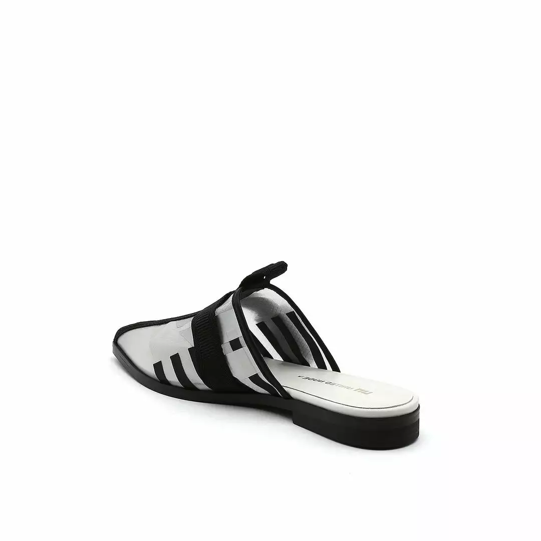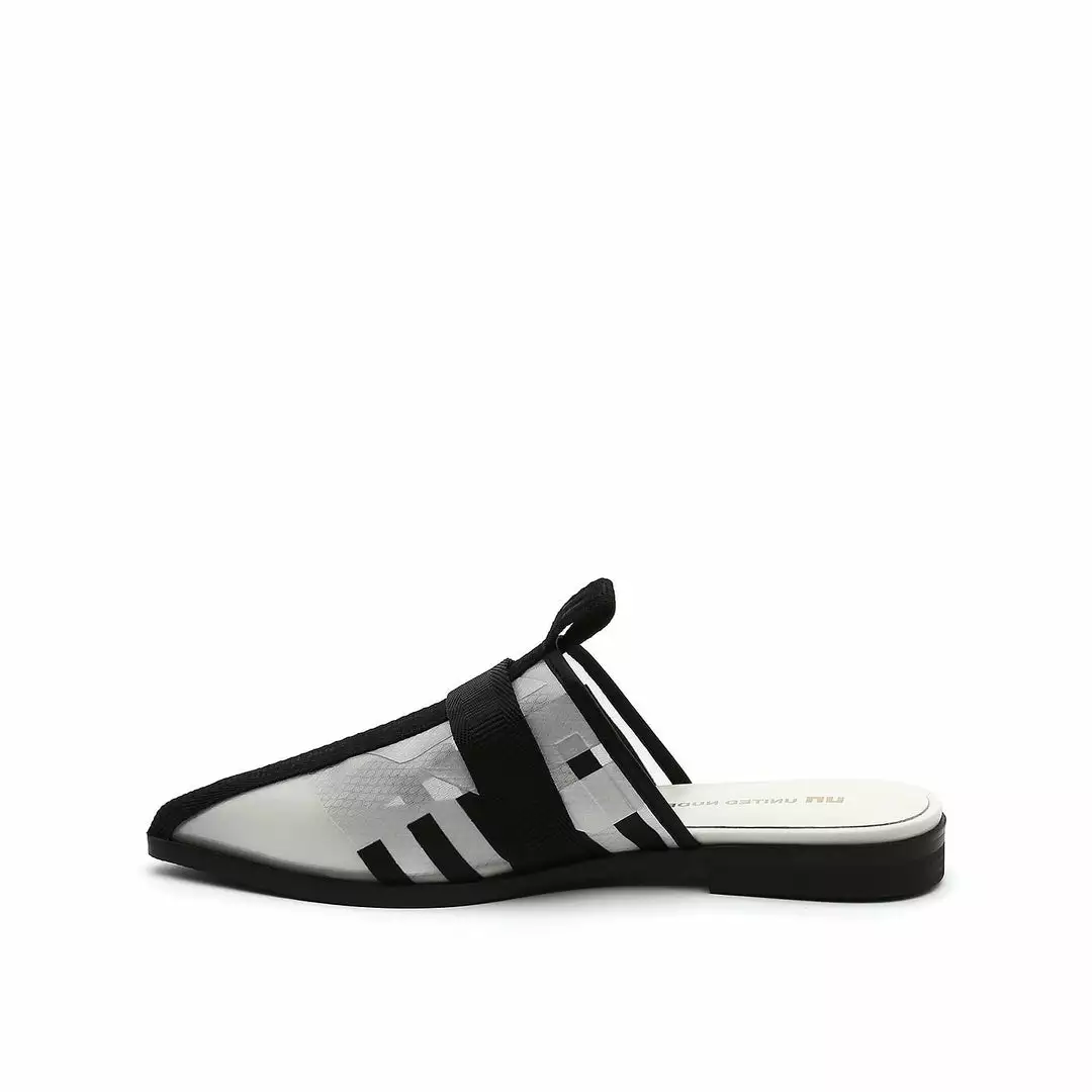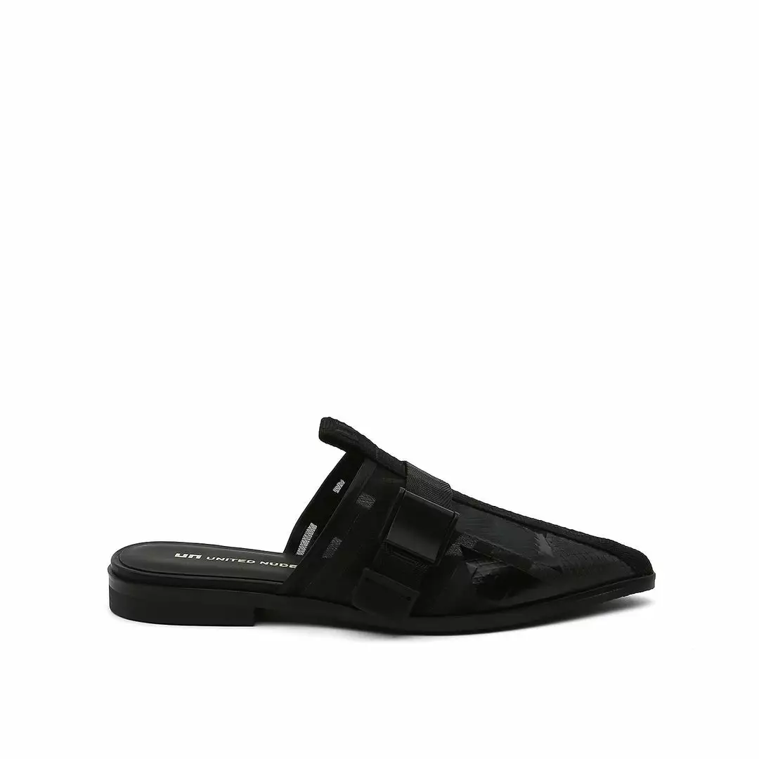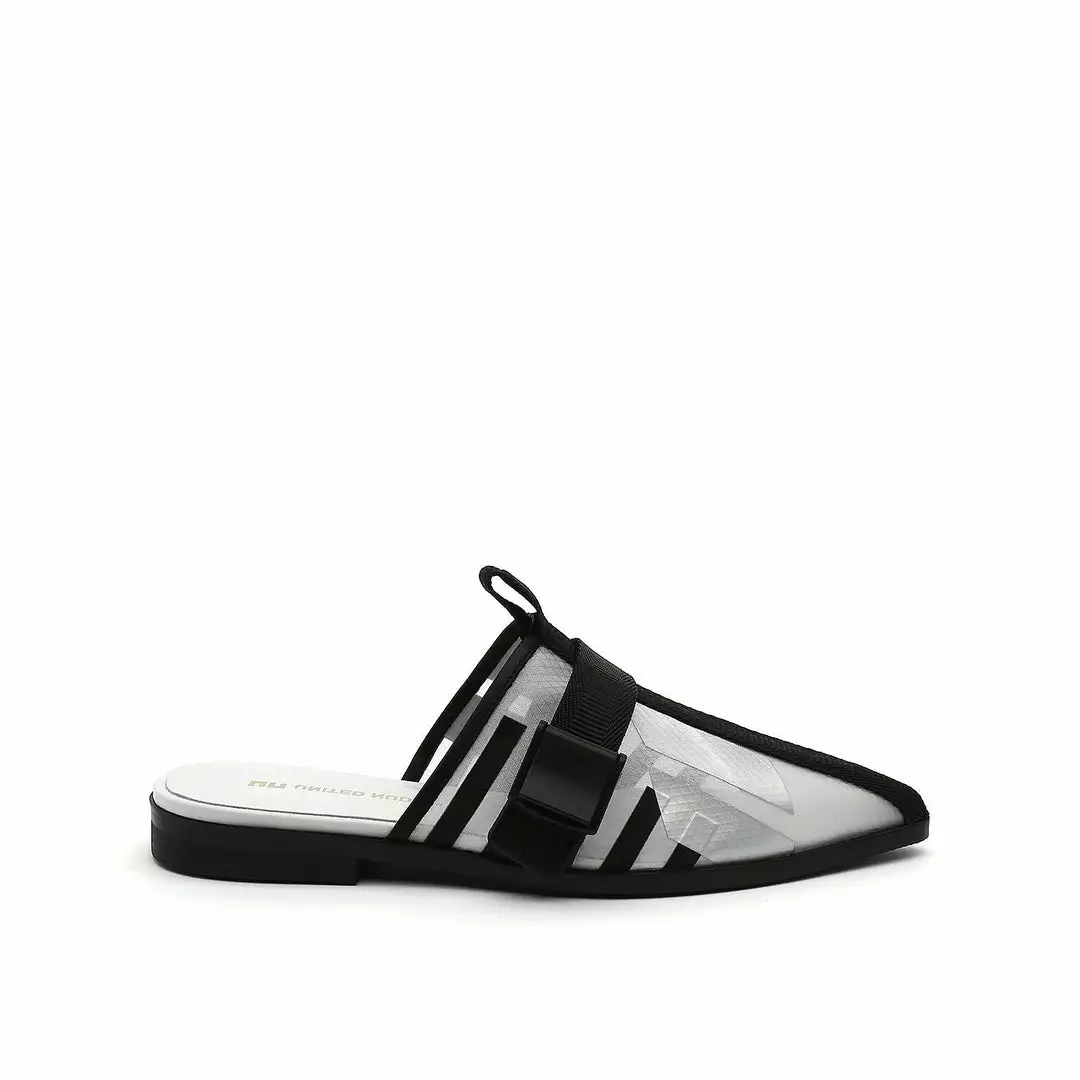 Contrasting with the heat pressed linear graphics, the adjustable strap adds a bold detail to the opaque nylon mesh upper on the fashion forward pointy-toe Calli Mule Lo.