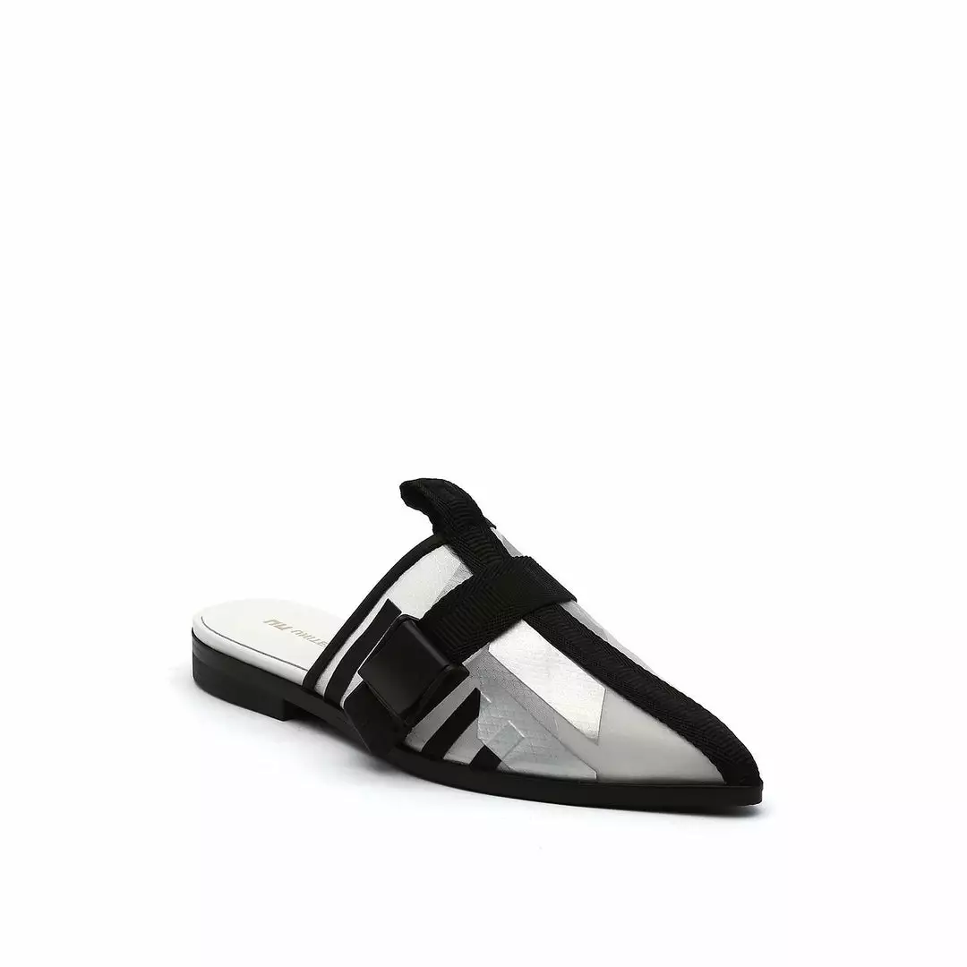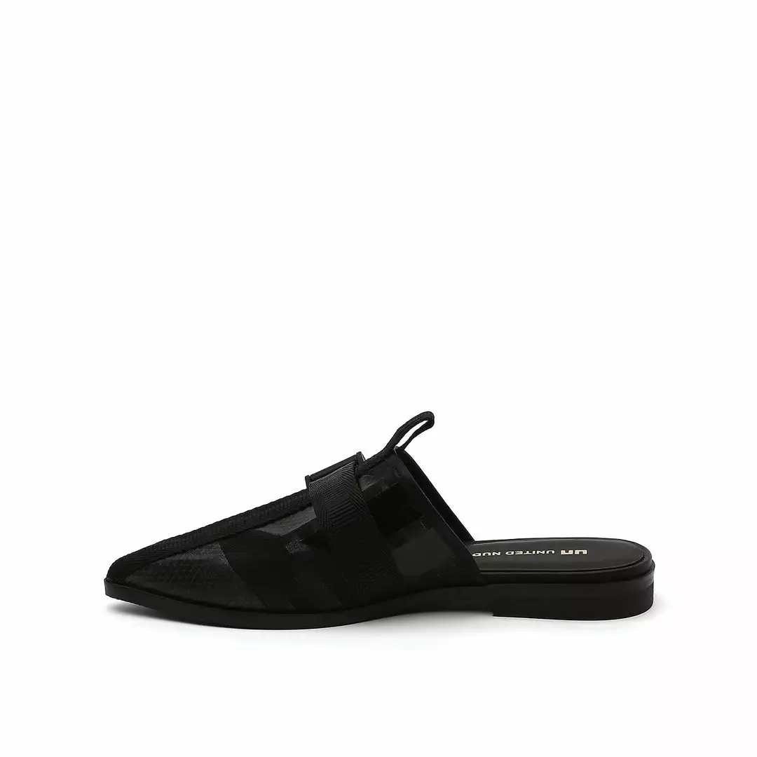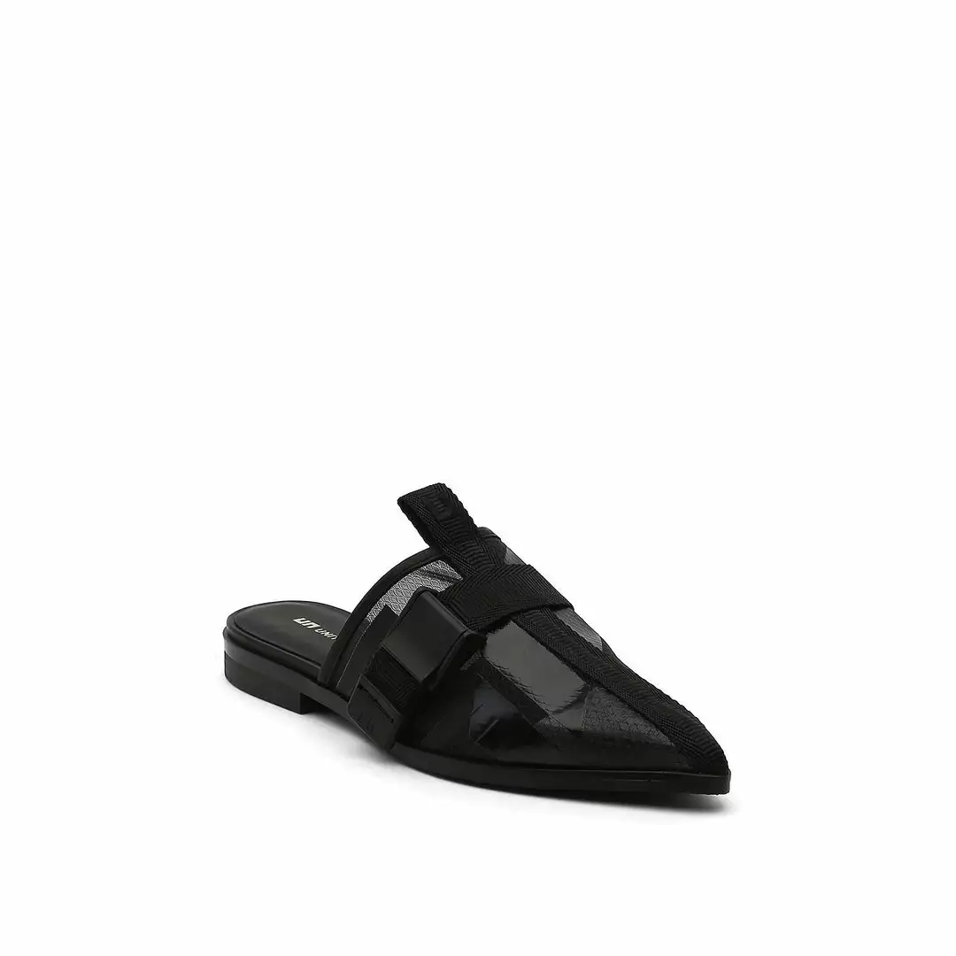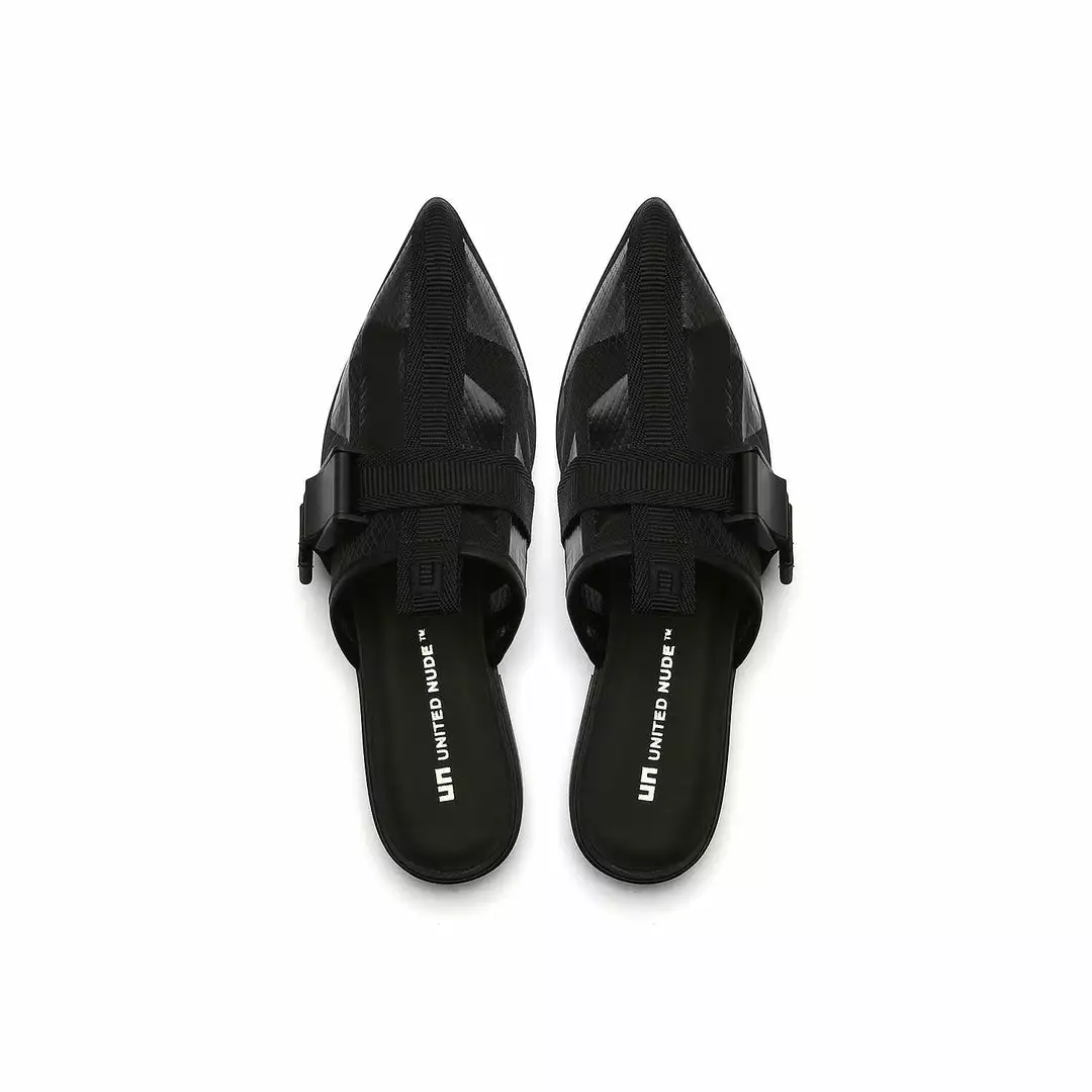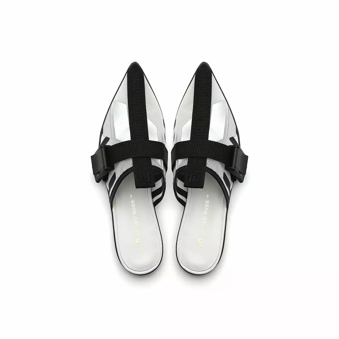 Contrasting with the heat pressed linear graphics, the adjustable strap adds a bold detail to the opaque nylon mesh upper on the fashion forward pointy-toe Calli Mule Lo.