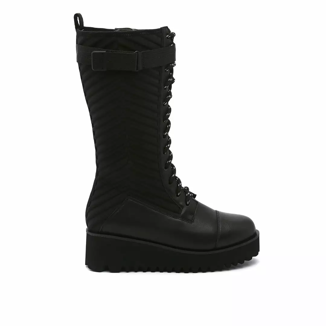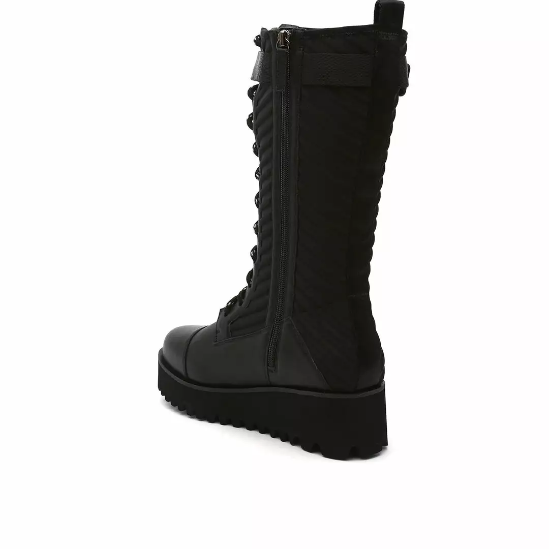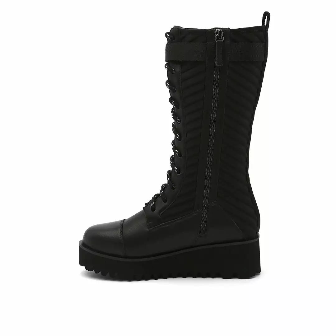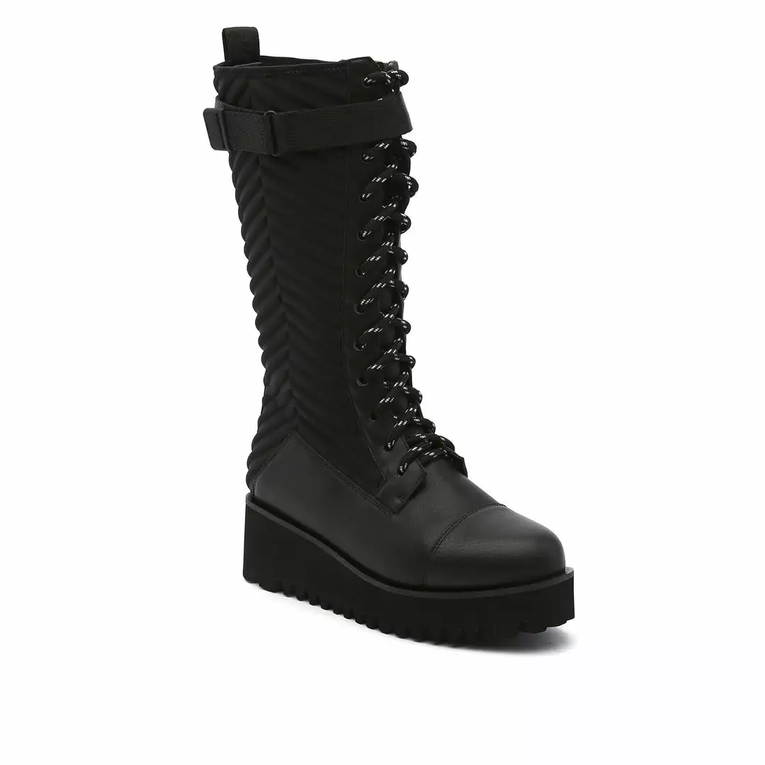 The Combat Tall Boot is a knee high combat boot with a quilted neoprene shaft and mixed textile upper that sits on a cleated platform sole. Ultra plush lining crafted from eco-fur ensures a cozy and comfy fit for the coldest of days.