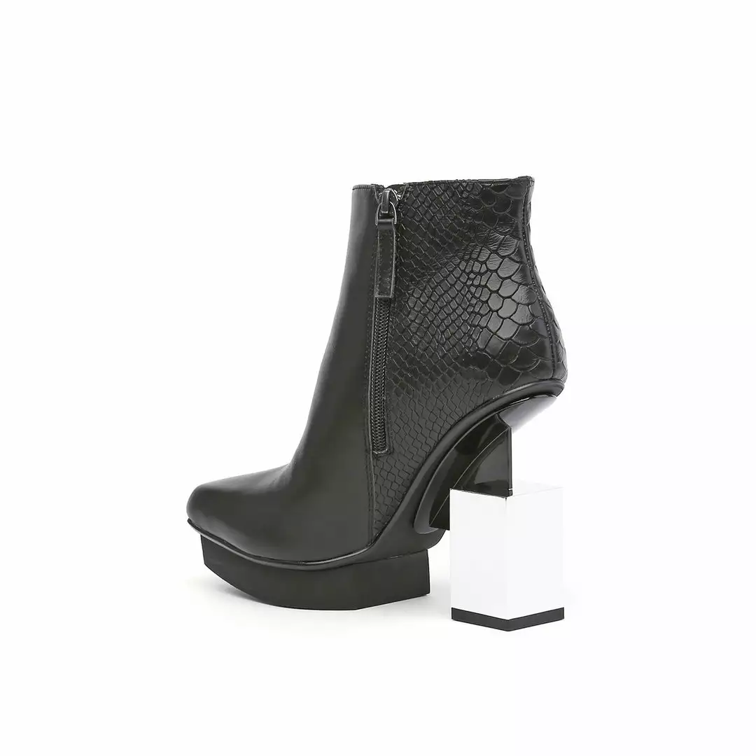 The Cube Boxy Hi is a high heel, square toe ankle boot grounded by a geometric block heel. A thin metallic structure extends from the shank to bisect the heel, giving a gravity defying illusion.