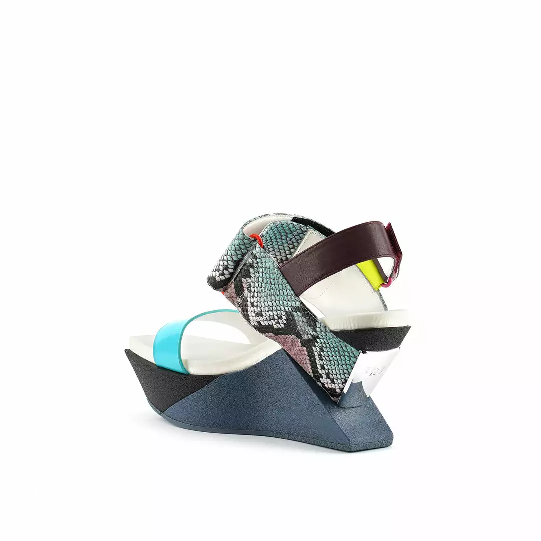 The Delta Wedge Sandal is a squared toe sandal lofted by a bold, cantilevered platform. Adjustable leather straps fitted with velcro closures offer a customized fit and maximum comfort