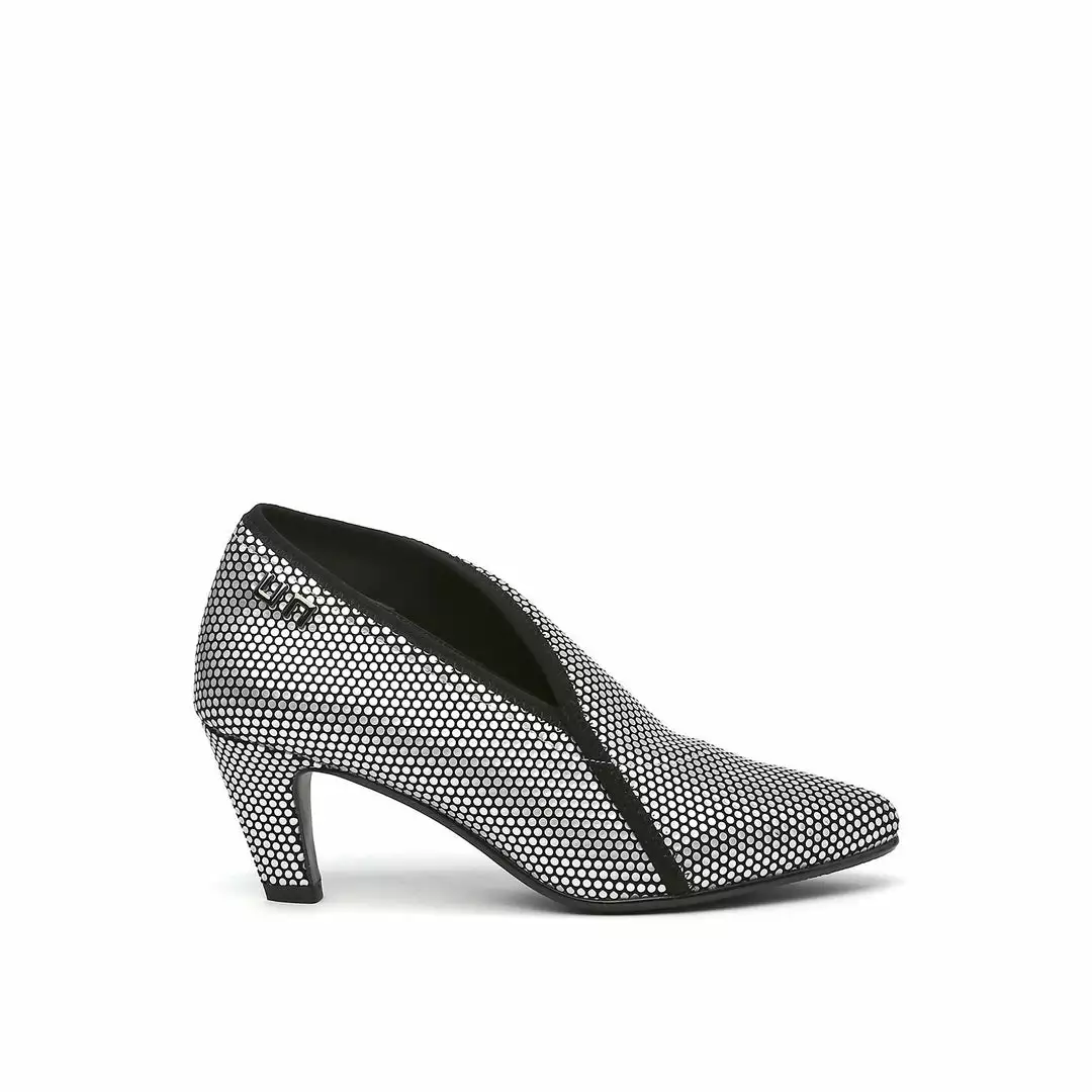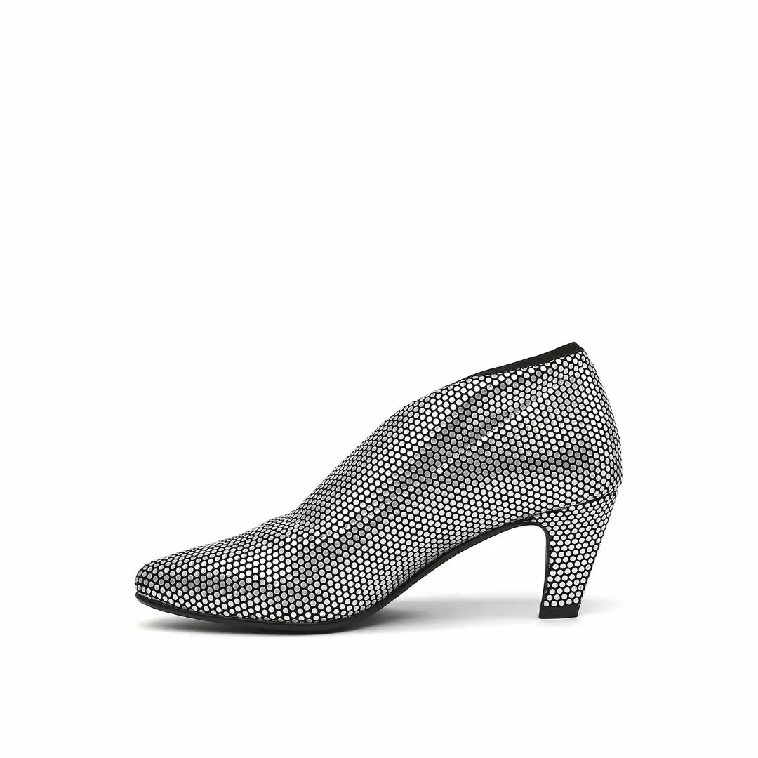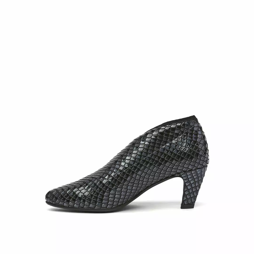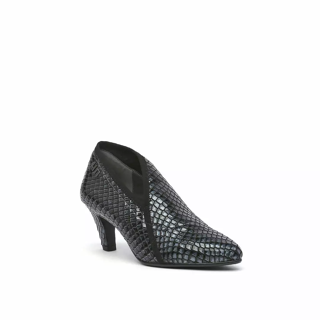 The Fold Lite Mid is a mid-heel ankle bootie with a soft almond toe and asymmetrical top line.