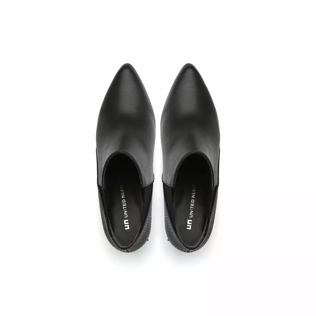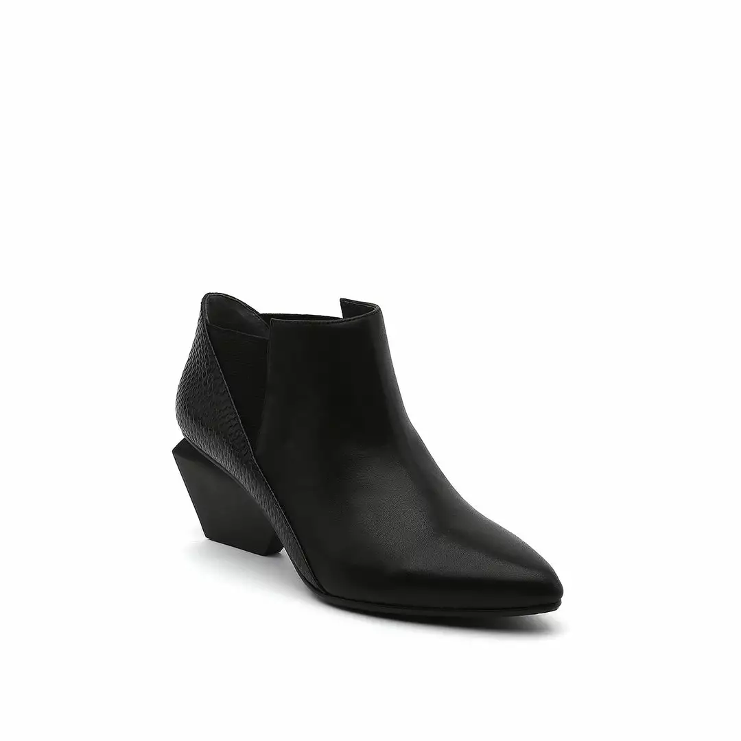 The Jacky Mid is a Chelsea boot with a modern twist featuring the carry-over mid heel. Sharp diagonal lines and a pointy toe accentuate the angular leather-stacked heel while the textured rubber outsole offers extra grip.