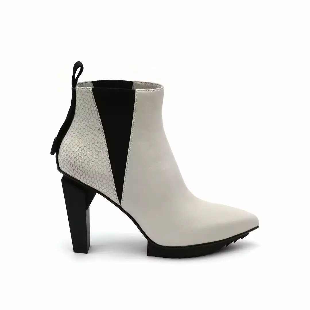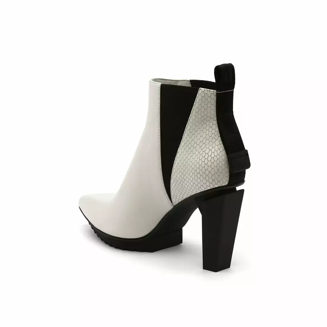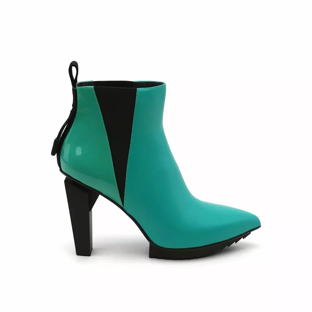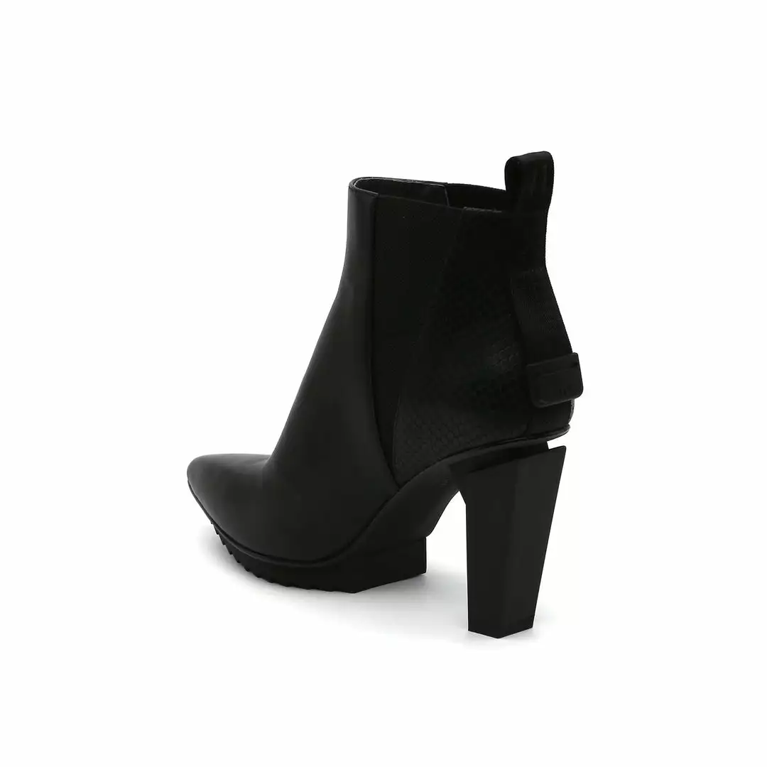The LEV Tek Bootie Hi is a pointy-toe high heel that is lifted by an angular high heel and cleated rubber platform. Rear pull straps and a triangular elastic panel fortify the style while adding functionality.