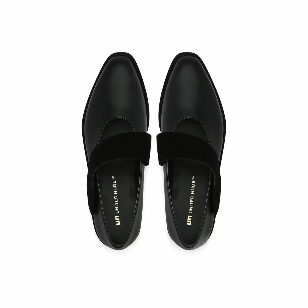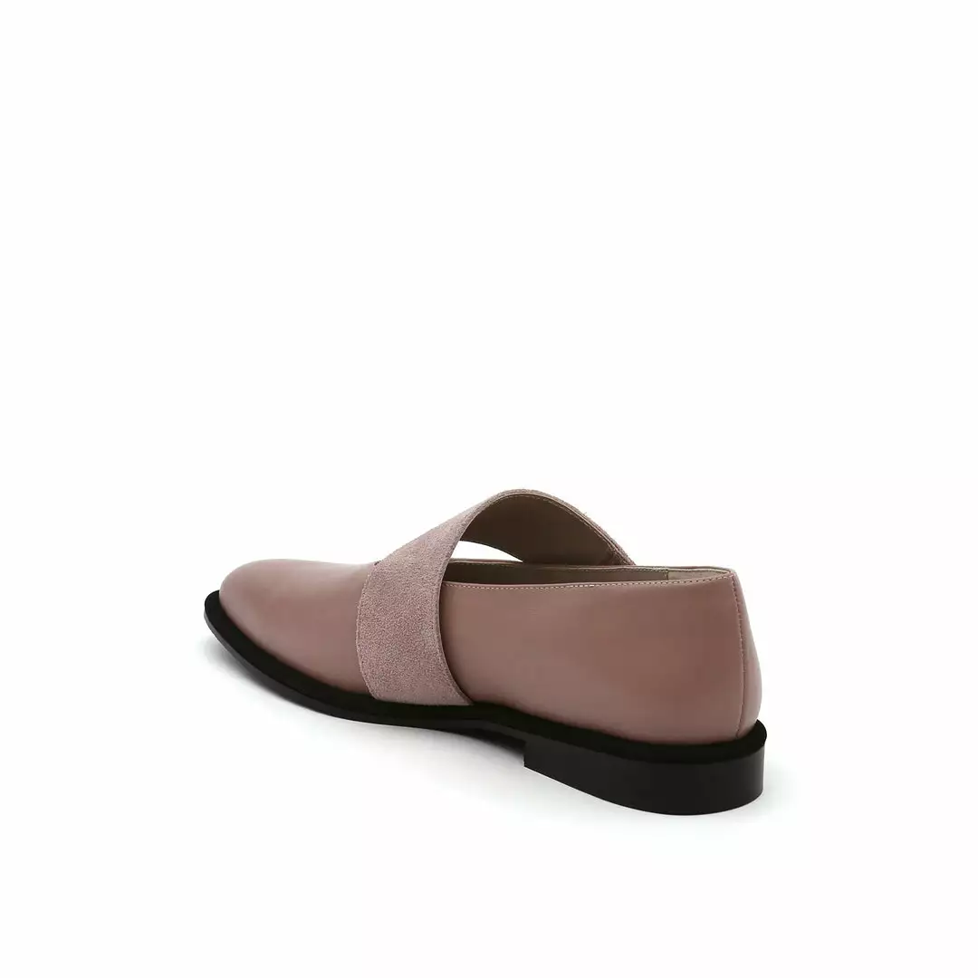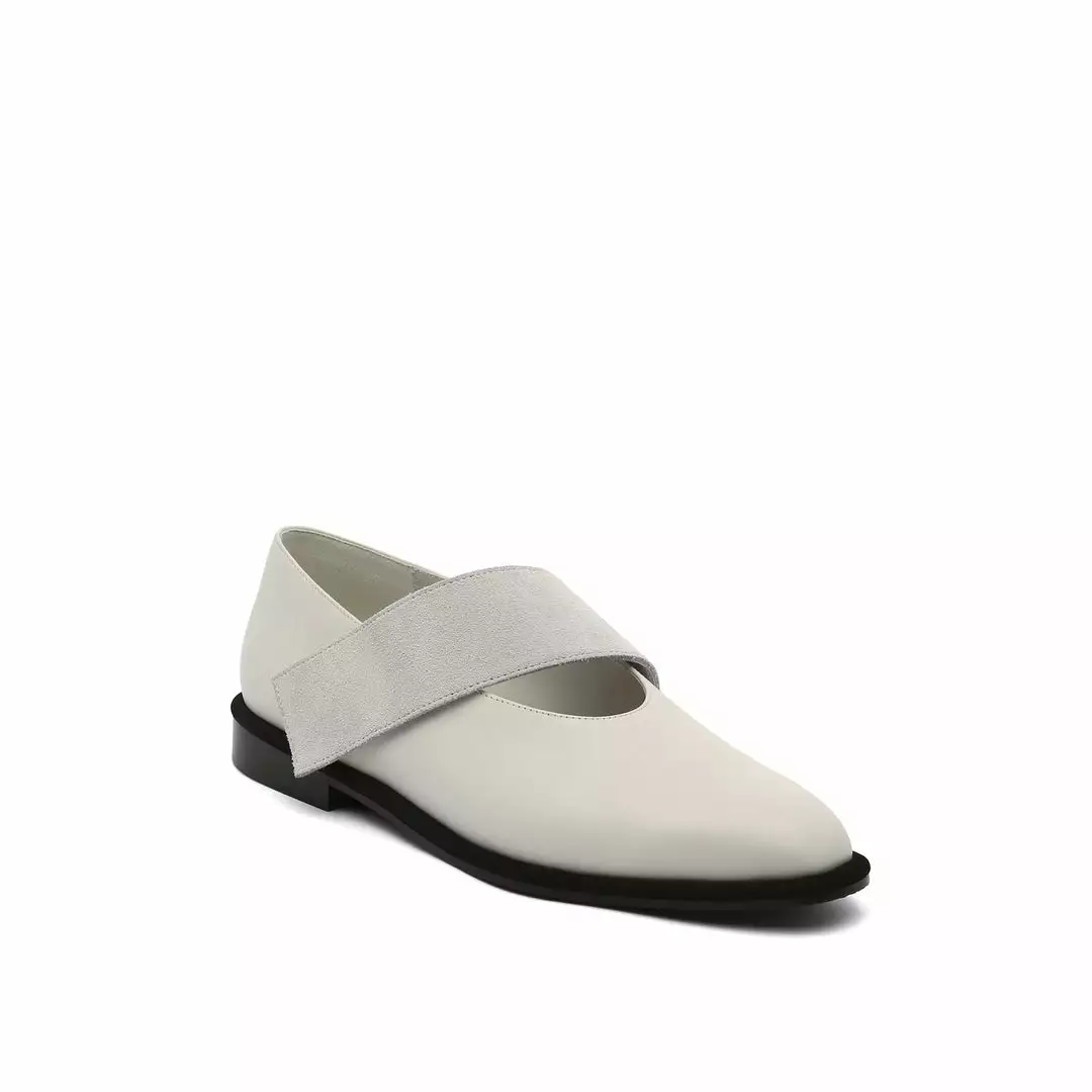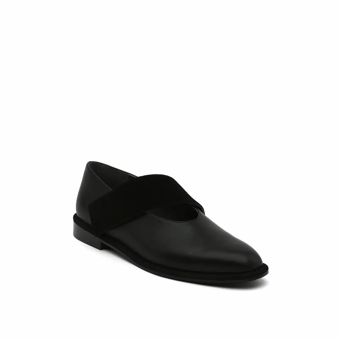 The Pure Mary is a modern leather crafted Mary jane with a broad contrasting suede strap that fastens diagonally over the foot for a secure fit.