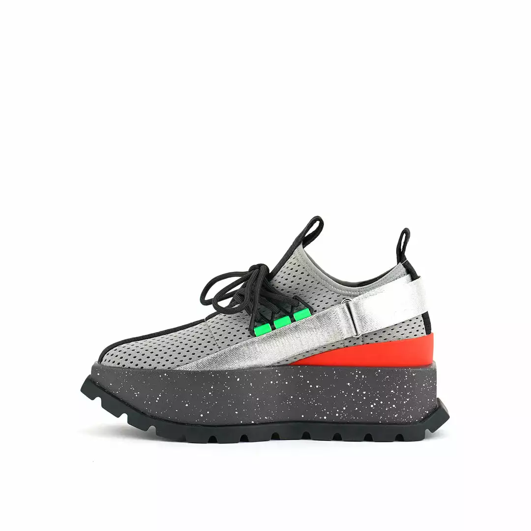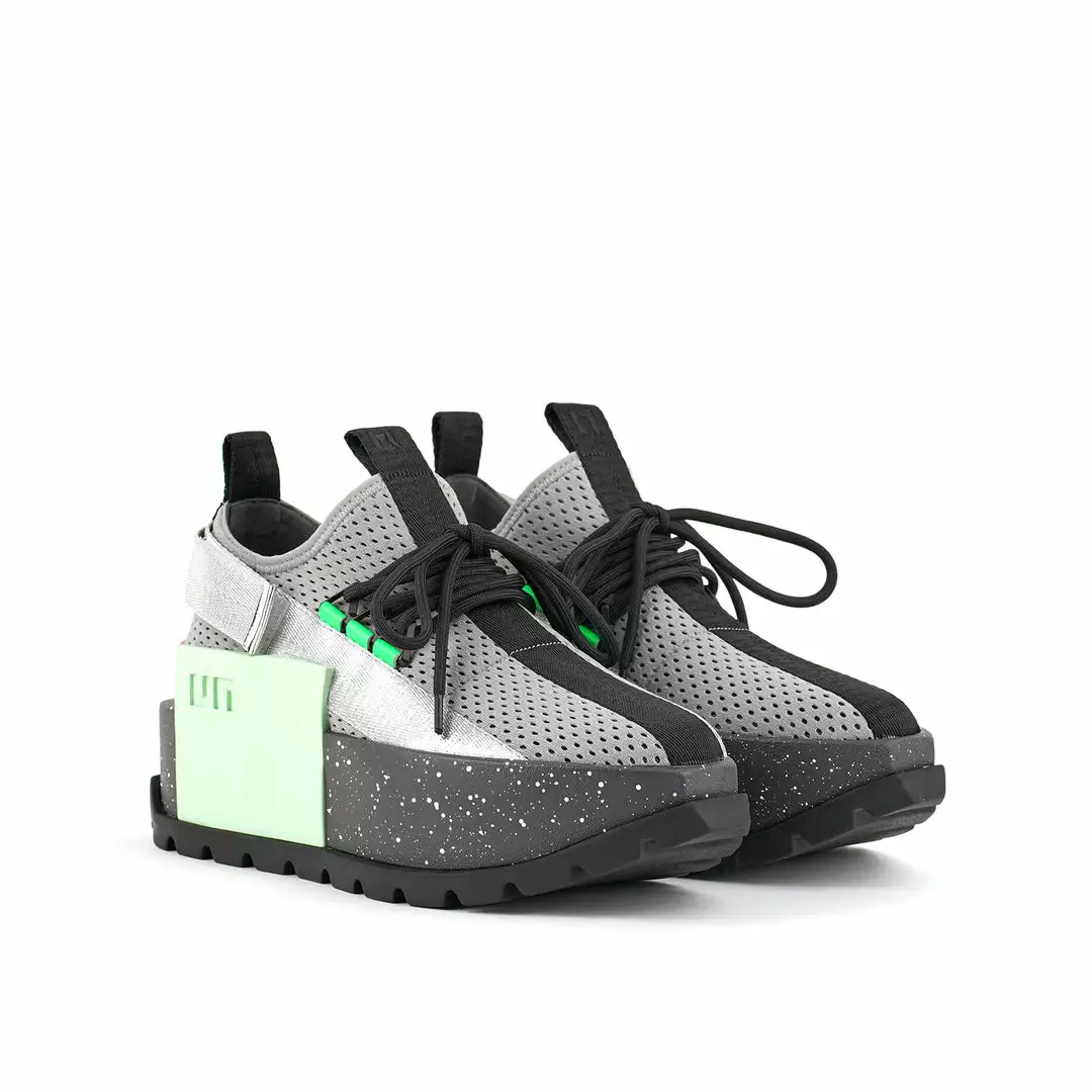 The Roko Space is a wedge platform sneaker lifted by a bold cleated outsole. The geometric silhouette features United Nude’s signature aesthetics, a lace-up design with metal hardware, breathable fabric, velcro straps, signature pull-ups, and a defining block logo.