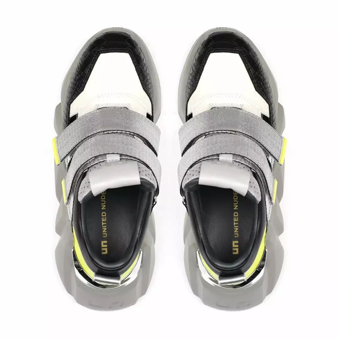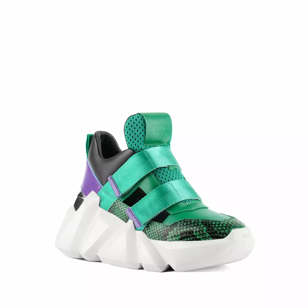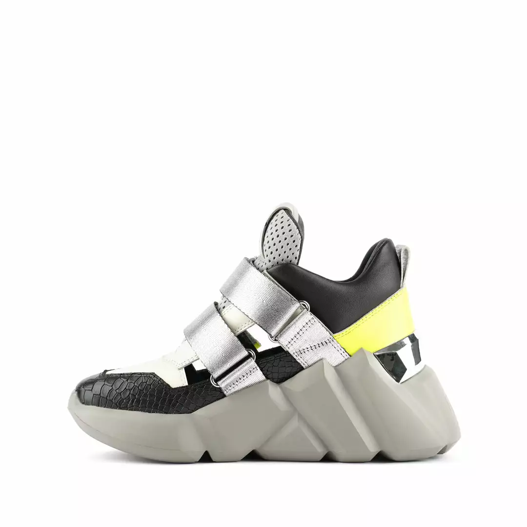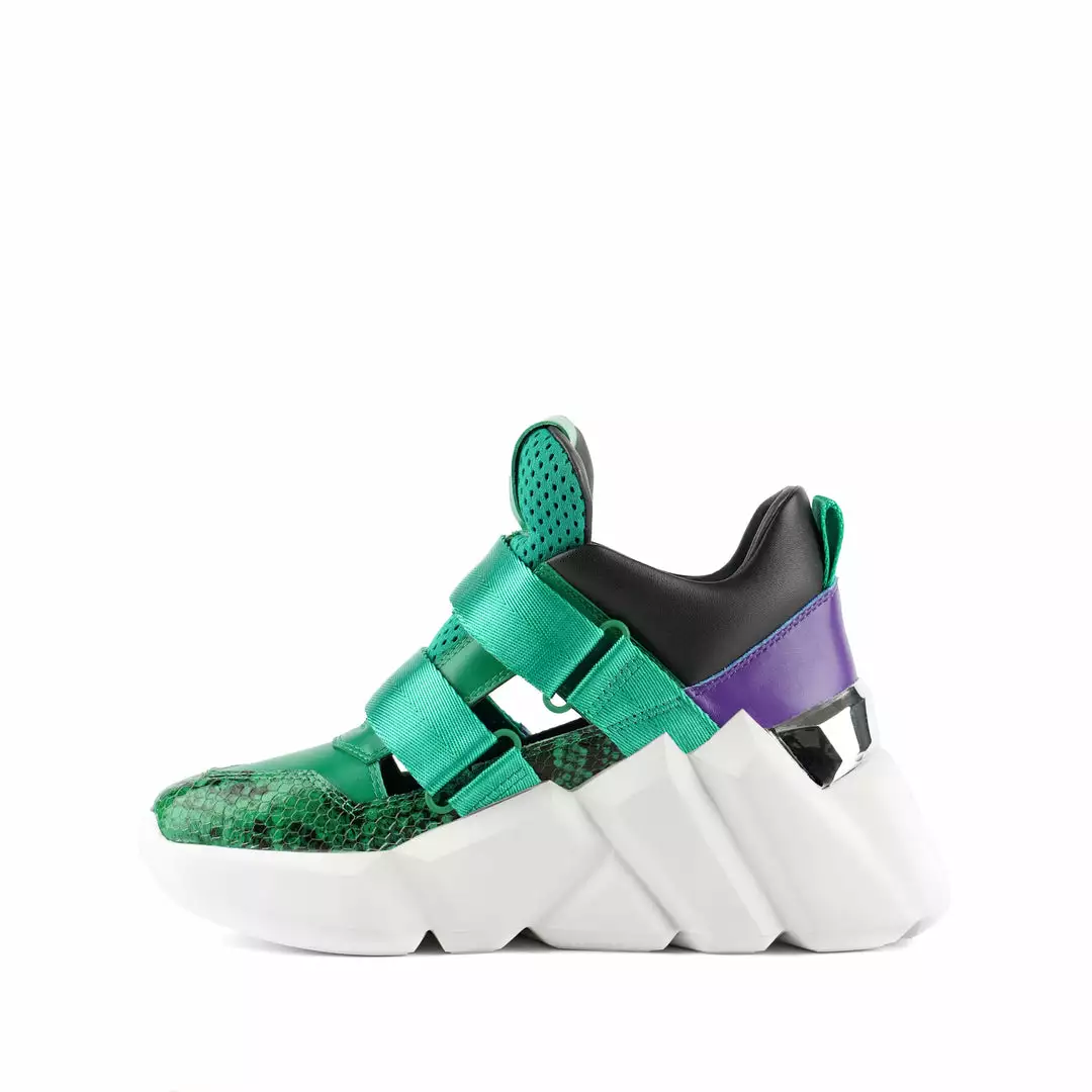 The Space Kick Summer is a cutout sneaker with a statement wedge sole. The chunky EPR outsole soars into the double velcro enclosure upper with breathable cutout details.