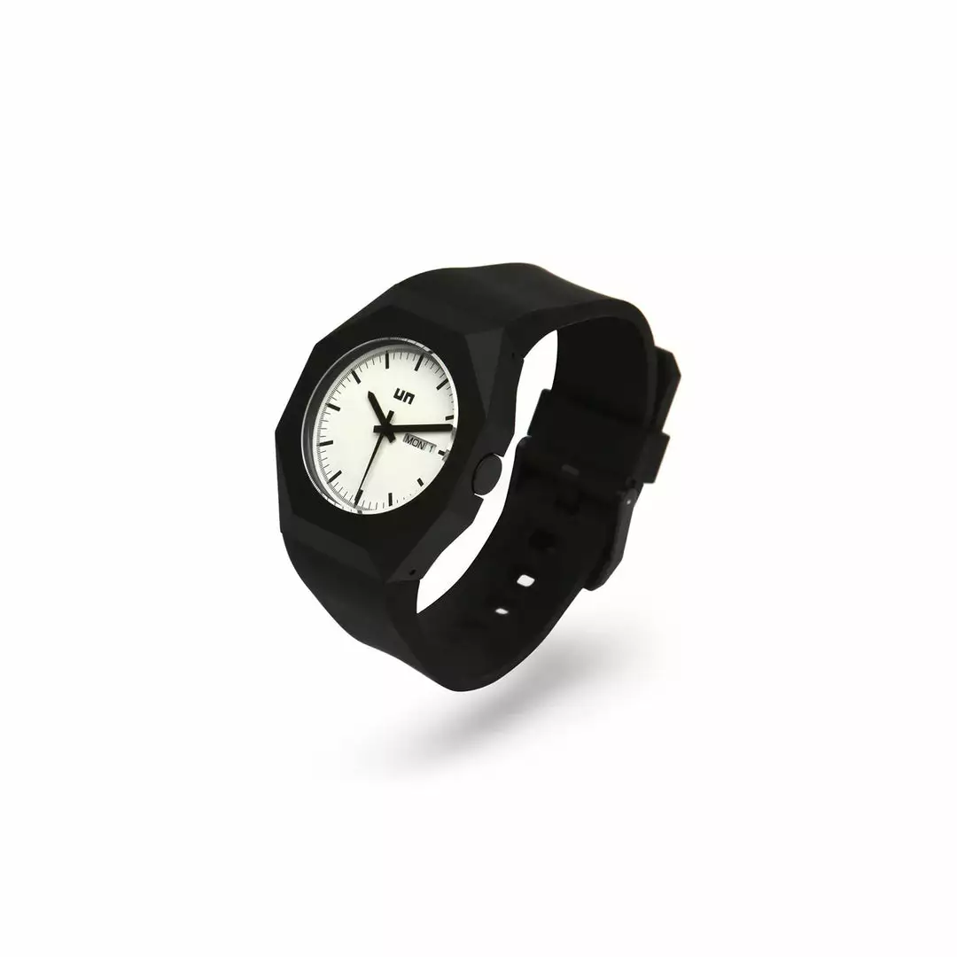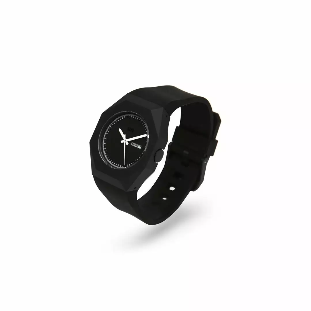 The Stealth Analogis a contemporary play on 70s watch design. It features a circular face and a faceted case design. Water-resistant and is equipped with a Japanese Miyota movement displayingtime, day, and date.