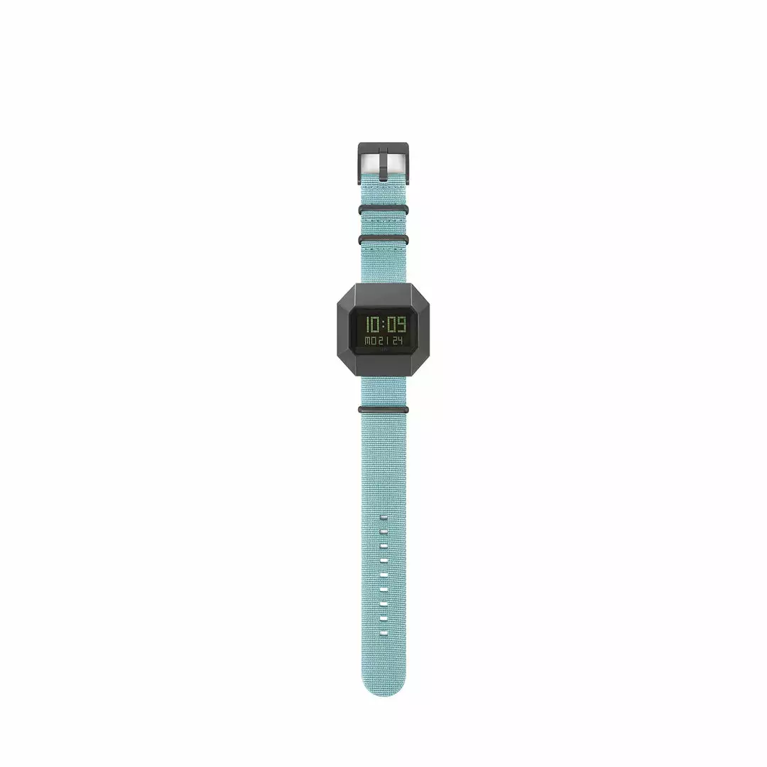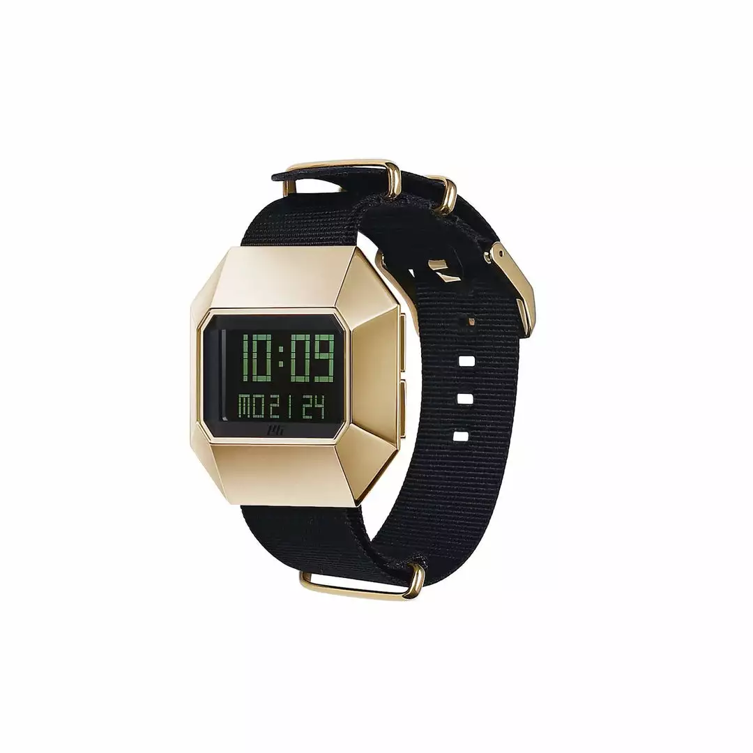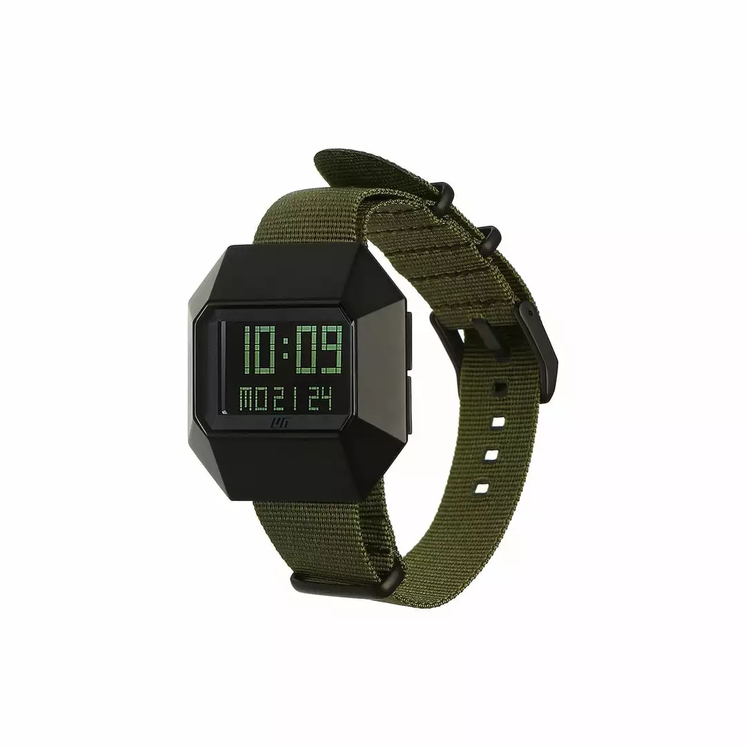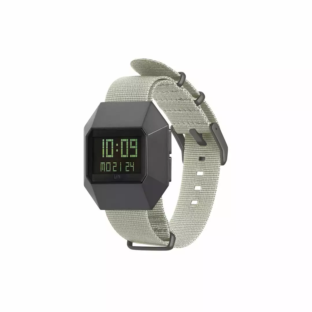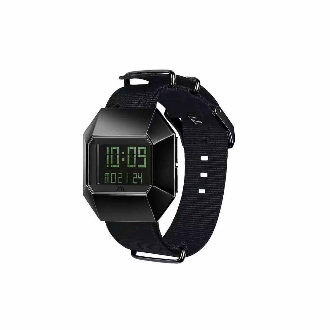 The Stealth Digital Nylon is a minimal hexagonal digital watch with a nylon band. Water-resistant and equipped with a United Nude custom-made movement with time, day, date, and backlight functions.