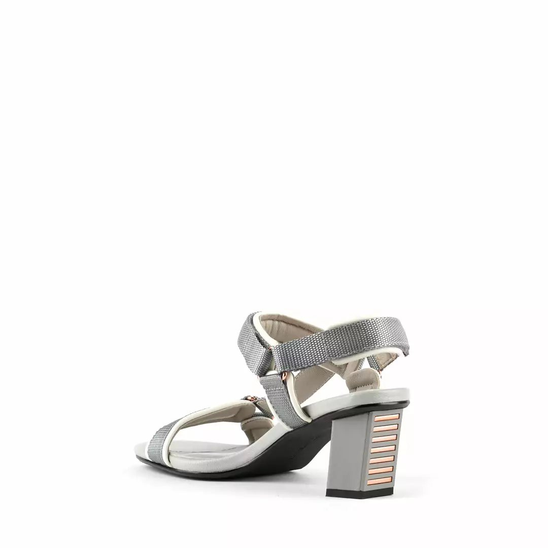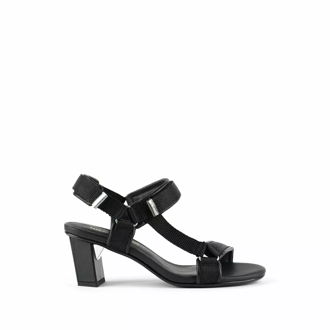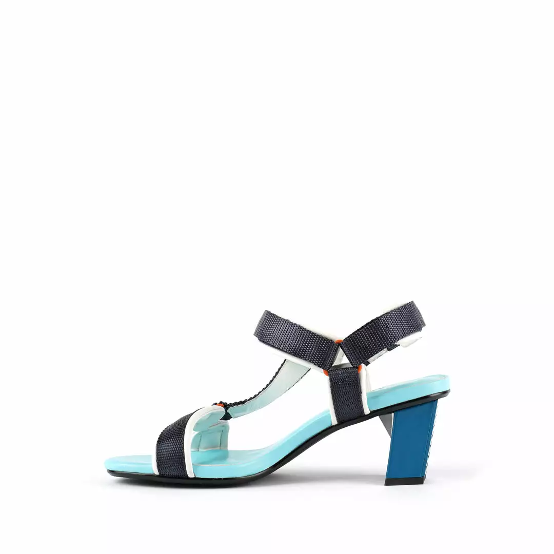 The Aura Mid is a sporty mid heel sandal that sits on a leather wrapped angular heel with inset laddered metallic detailing and a chromed triangular wedge that extends from the shank. Utilitarian style nylon belts with two adjustable velcro enclosures complete the look.