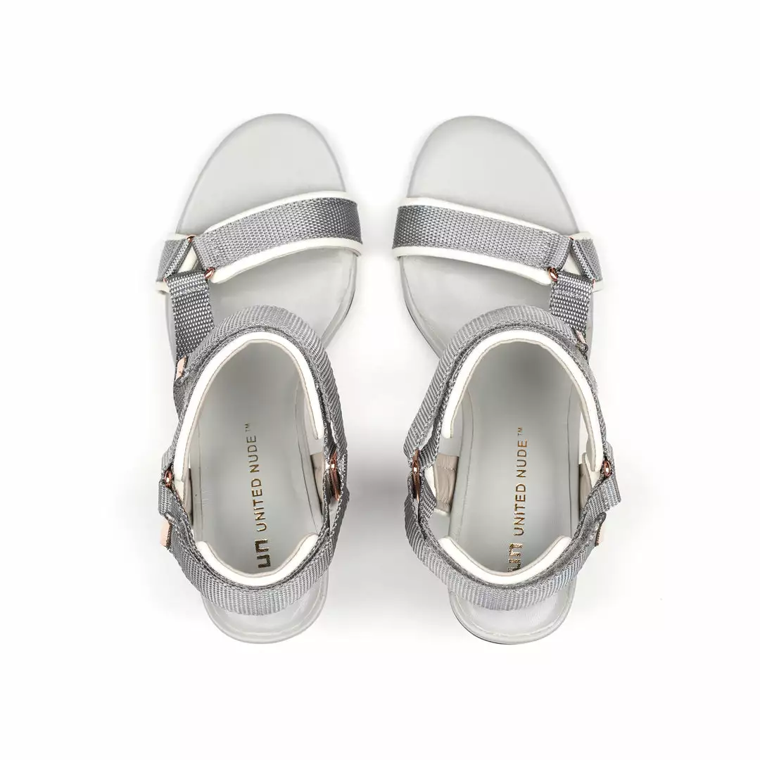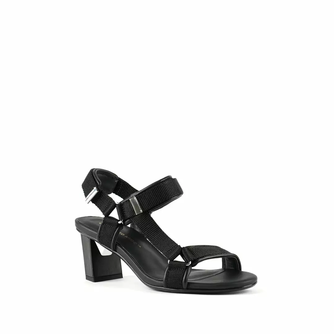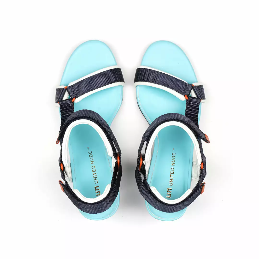 The Aura Mid is a sporty mid heel sandal that sits on a leather wrapped angular heel with inset laddered metallic detailing and a chromed triangular wedge that extends from the shank. Utilitarian style nylon belts with two adjustable velcro enclosures complete the look.