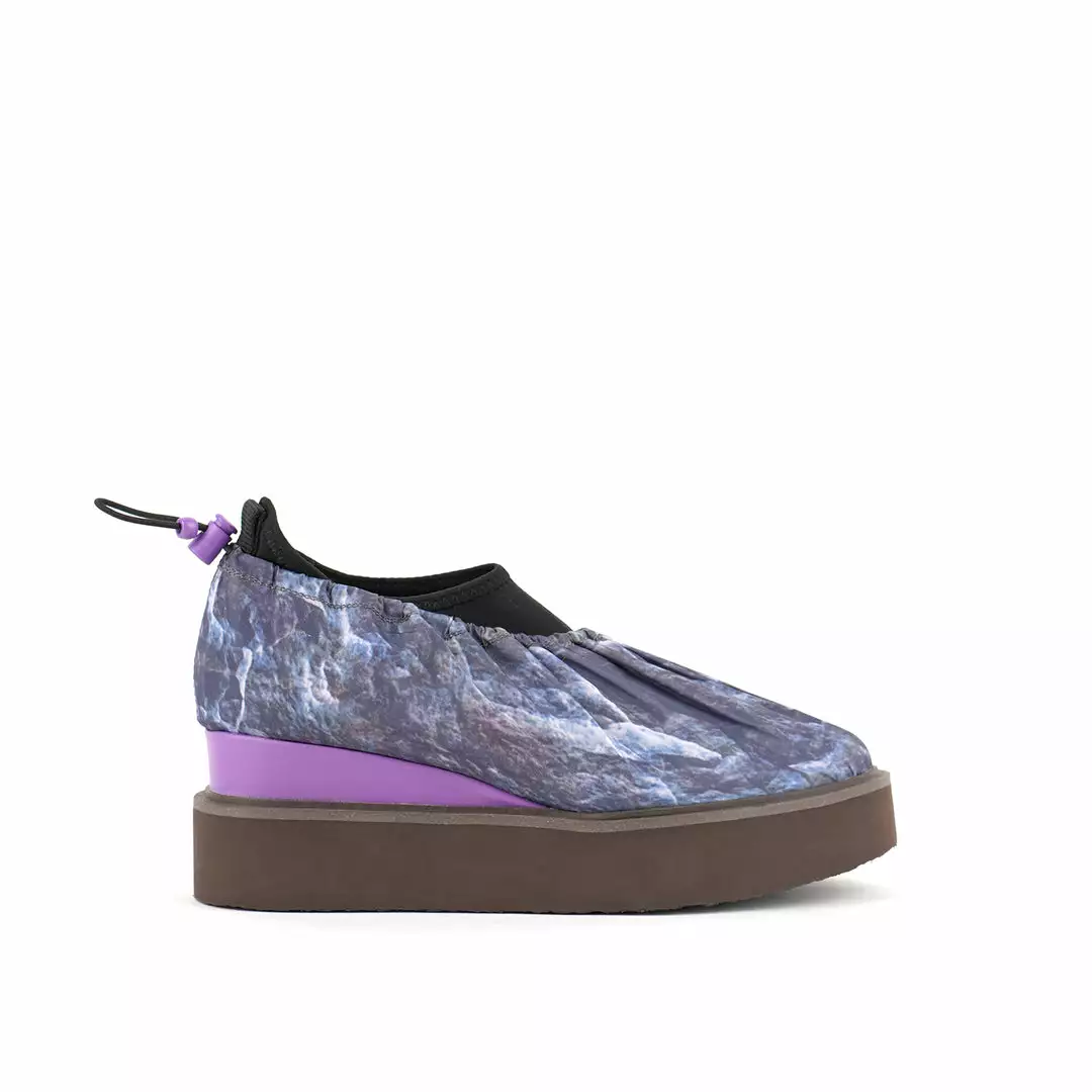 The Cover Casual is a comfortable flatform slip on with a sock-like neoprene upper and a nylon fabric overlay. An exposed wedge adds a gentle lift. This style is inspired by the outdoors – finished with a light collapsible fabric, a ruched topline, and an adjustable drawstring toggle.