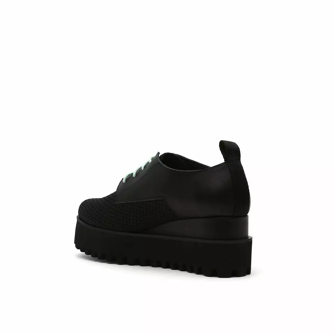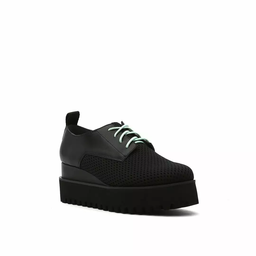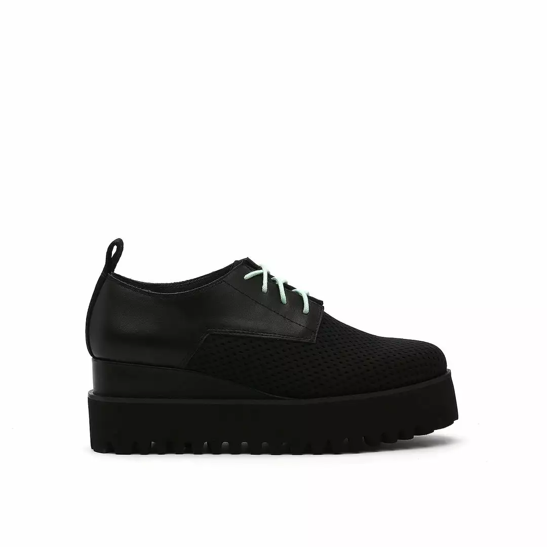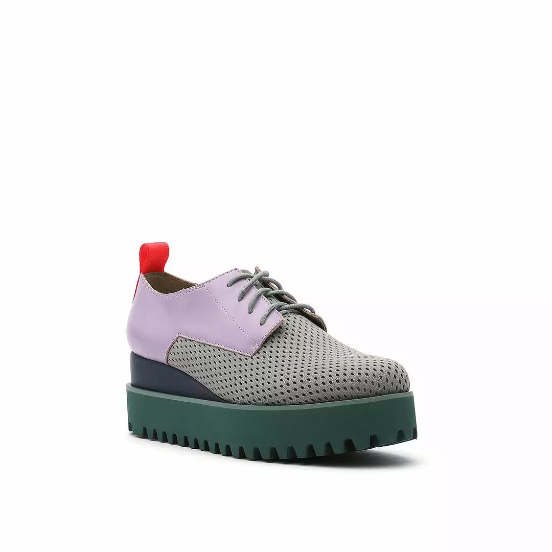 The Juko II is a flatform oxford shoe that is lifted by a low leather wrapped wedge and cleated outsole.
