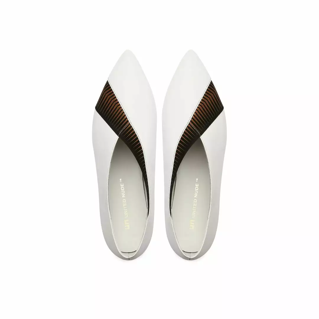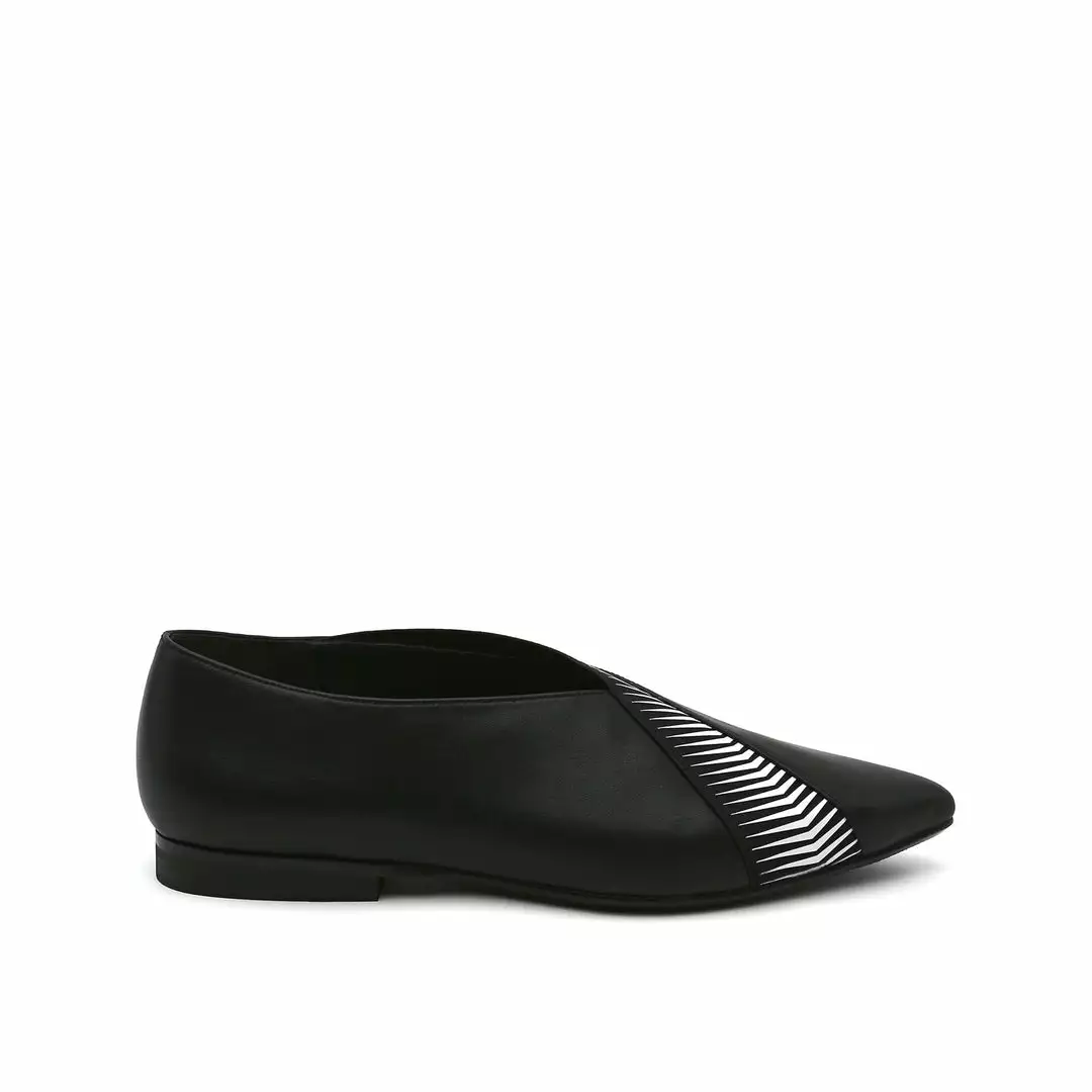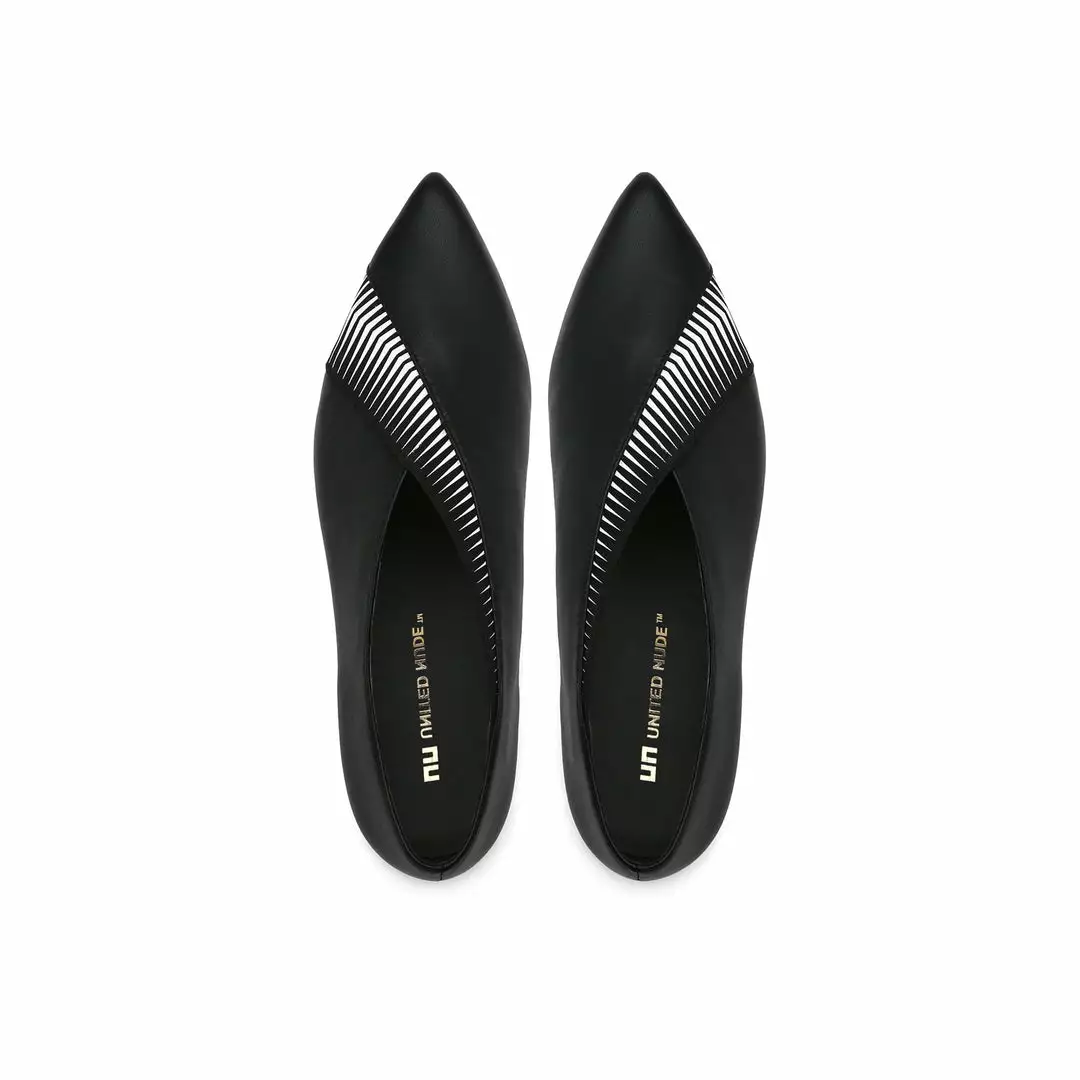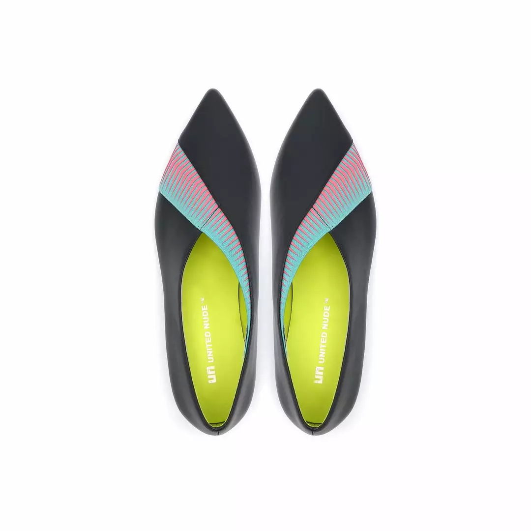 The Peek Pump Lo is a pointy-toe flat with an asymmetrical top line. The elastic accent packs a bold graphic punch.