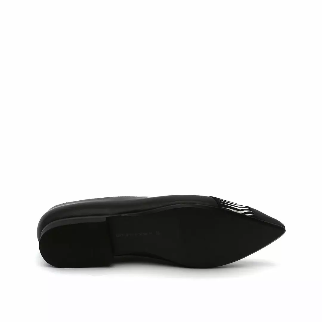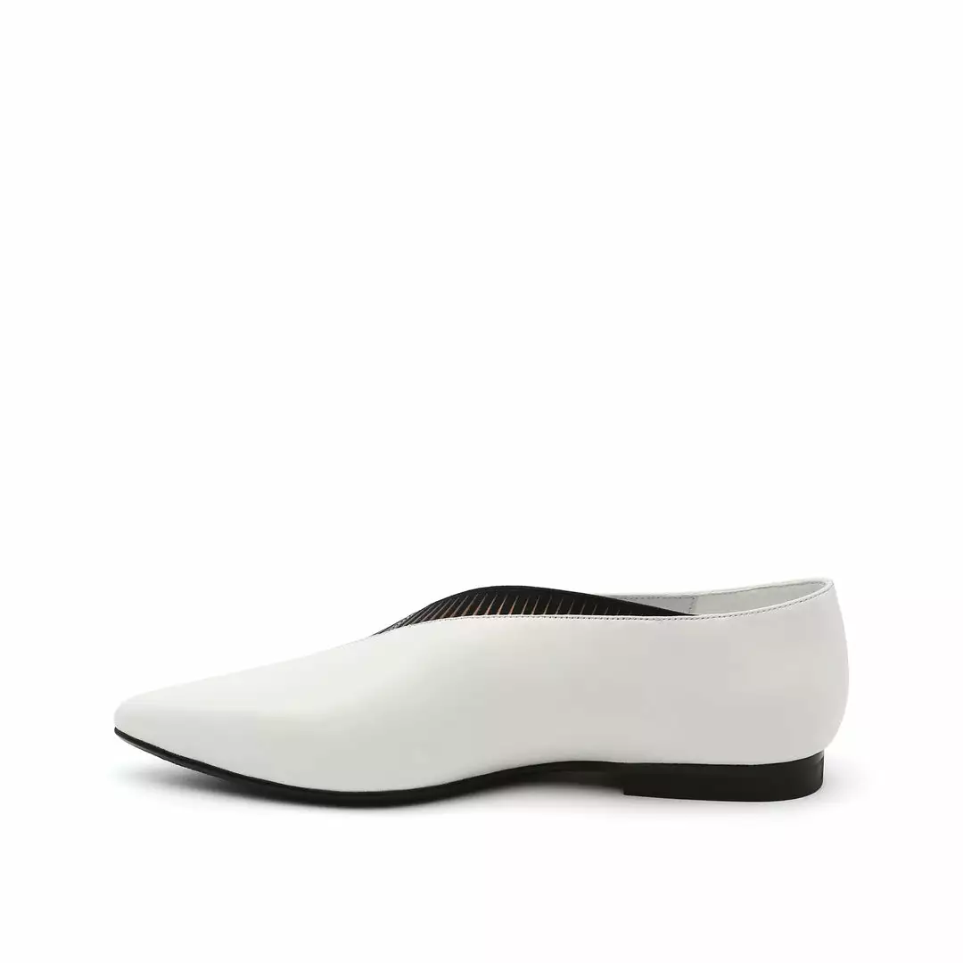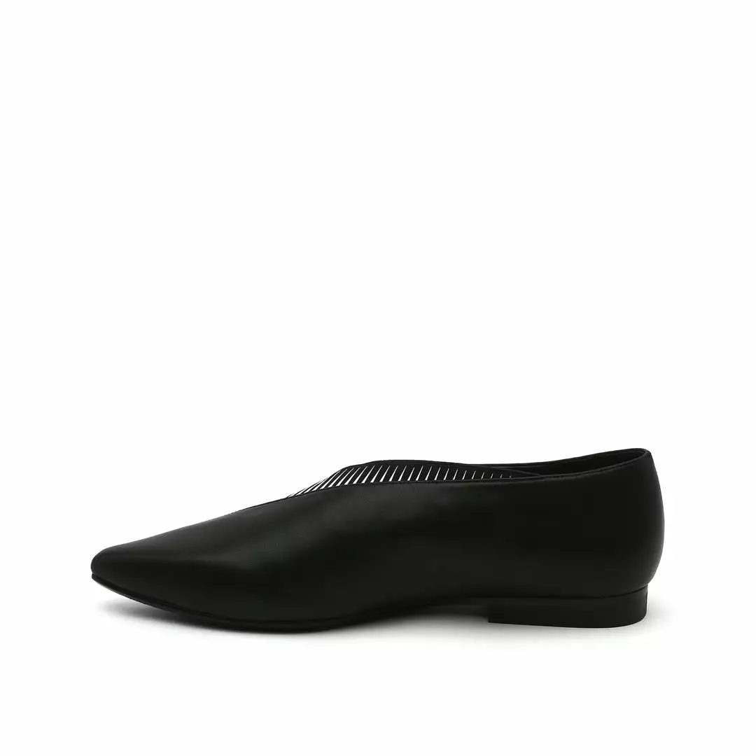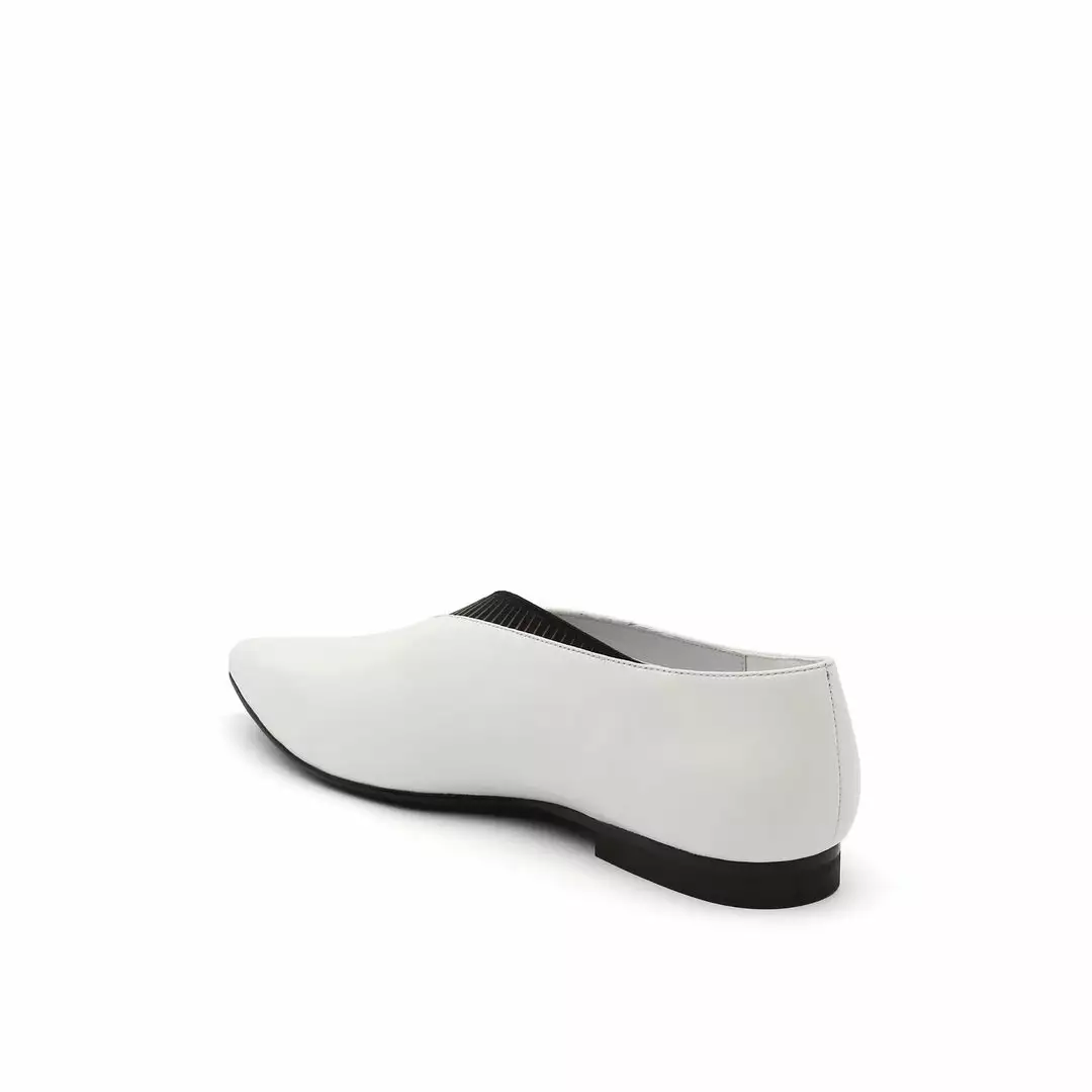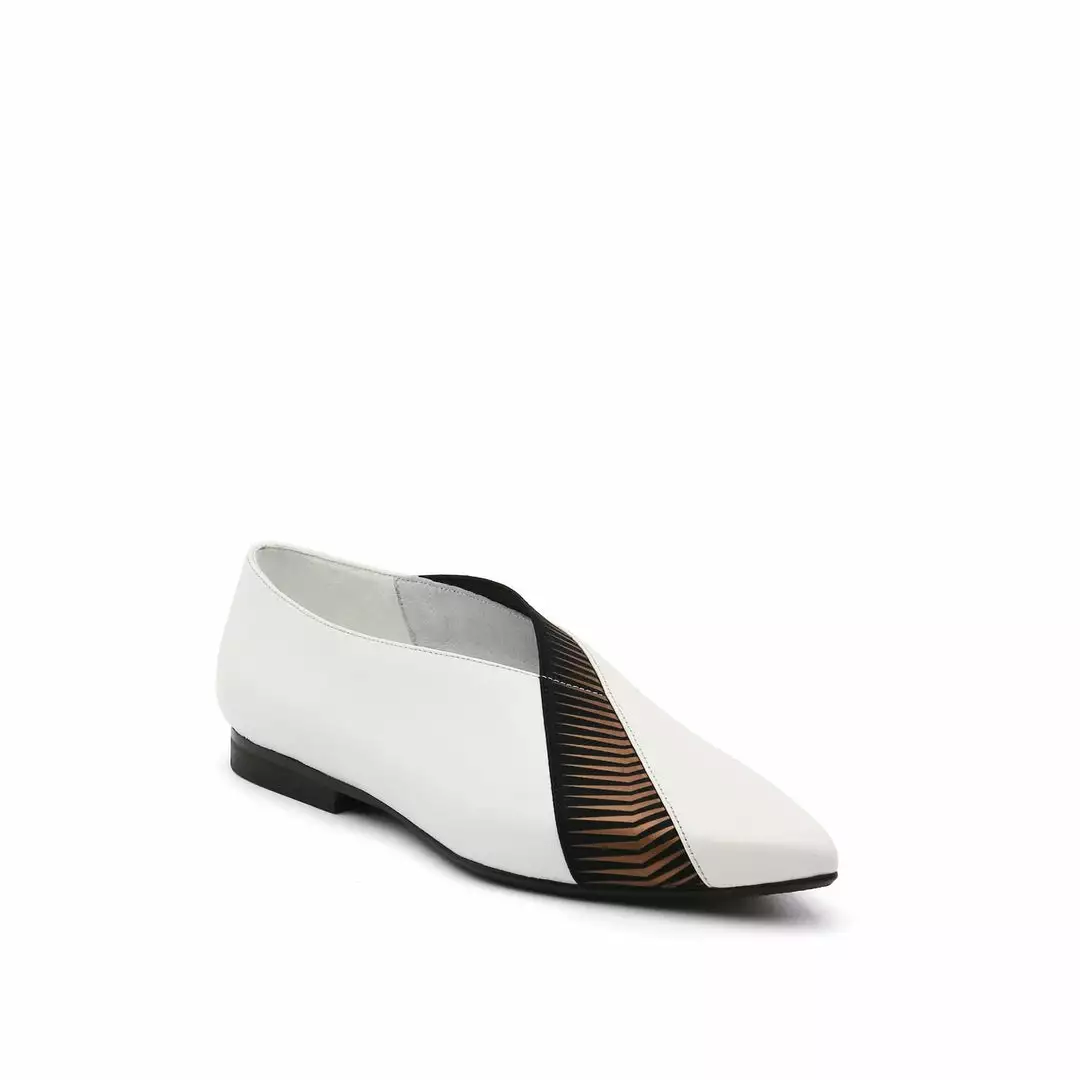 The Peek Pump Lo is a pointy-toe flat with an asymmetrical top line. The elastic accent packs a bold graphic punch.