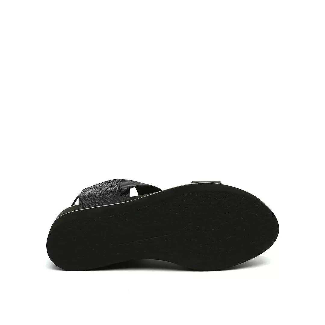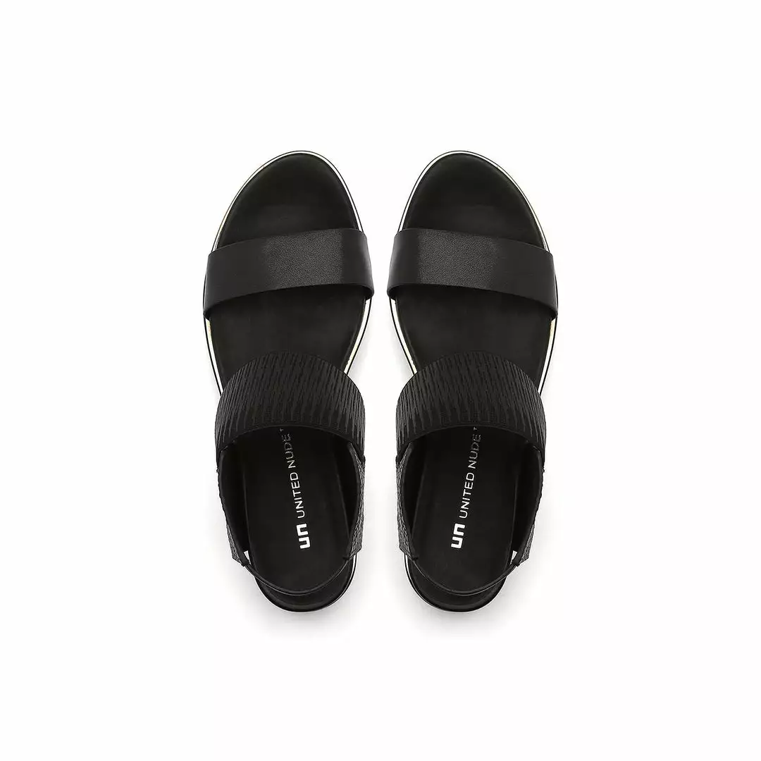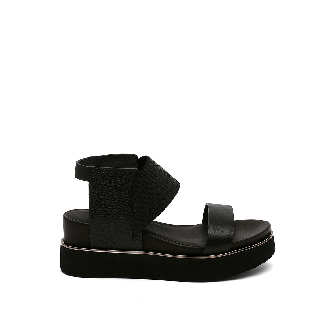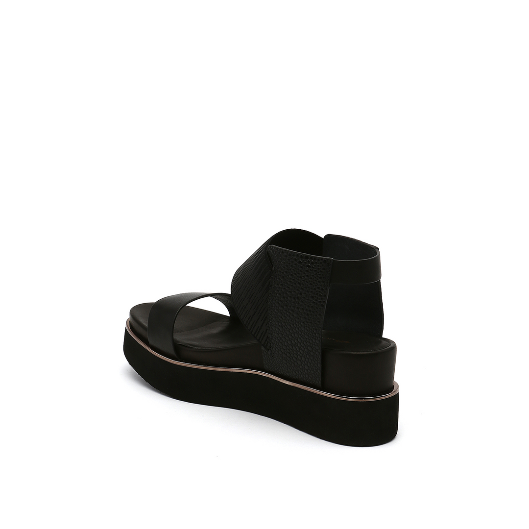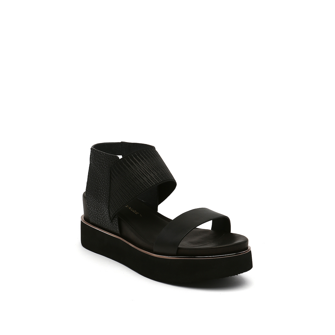 The Rico Sandal is a flatform slip on sandal with an exposed wedge for a gentle lift. The straps are materialized with a combination of leathers and elastics to elevate this signature style.