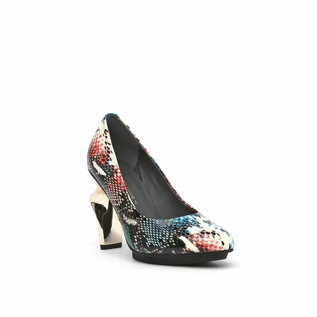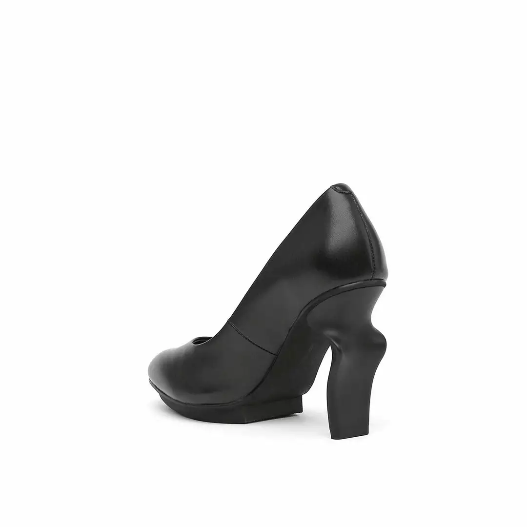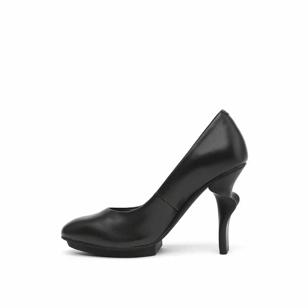The Twirl Pump is a high heel pump. The classic pump silhouette is refreshed with a contemporary sculptural heel and rubber platform.