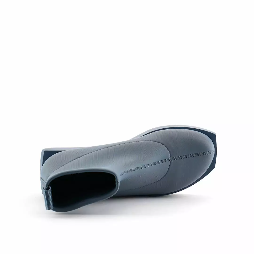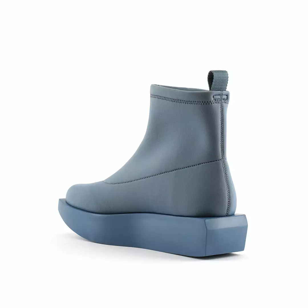 The Wa Bootie Lo features a minimalist sock-like neoprene upper, padded leather insole, and platform rubber wedge.